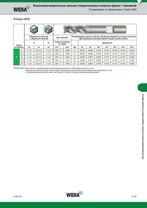 Высокопроизводительные цельные твердосплавные концевые фрезы Высокопроизводительные цельные твердосплавные концевые фрезы • Алюминий Рекомендации по применению • Серия 49G9 Серия 49G9 Обработка уступов (A)и обработка пазов (B)Без покрытияРекомендуемая подача на зуб (fz = мм/зуб) для обработки уступов и стенок (A).Для прорезания пазов (B) подачу fz следует снизить на 20%. AГруппа B Скорость резанияvc, м/мин Диаметр D1 материала ap ae ap min max мм 6,0 8,0 10,0 12,0 16,0 18,0 20,0 1 1xD 0,5 x D 1xD 500 – 2000 fz 0,072 0,096 0,120 0,144 0,192 0,216 0,240 2 1xD 0,5 x D 1xD 500 – 1500 fz 0,065 0,086 0,108 0,130 0,173 0,194 0,216 N 3 1xD 0,5 x D 1xD 500 – 1500 fz 0,050 0,067 0,084 0,101 0,134 0,151 0,168 4 1xD 0,5 x D 1xD 400 – 750 fz 0,058 0,077 0,096 0,115 0,154 0,173 0,192 5 1xD 0,5 x D 1xD 250 – 1000 fz 0,065 0,086 0,108 0,130 0,173 0,194 0,216 ПРИМЕЧАНИЕ. Для станков с керамическими подшипниками величину ap необходимо умножить на 0,5. Верхние значения скоростей соответствуют идеальным условиям. При использовании фрез диаметром >12 мм на обрабатывающих центрах невысокой мощности требуется корректировка режимов резания. widia.com O149