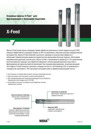 Концевые фрезы X-Feed™ для фрезерования с большими подачами X-Feed Фрезы X-Feed существенно сокращают время обработки закаленных сталей твердостью до 67 HRC, повышая эффективность режущих кромок на 50% по сравнению с обычным цельным твердосплавным инструментом. Фрезы X-Feed позволяют выполнять черновую и получистовую обработку с небольшой глубиной резания одним инструментом при чрезвычайно больших подачах, обеспечивая максимальный удельный съем металла. Фрезы X-Feed с занижением по диаметру 3 x D и увеличенным вылетом идеально подходят для обработки карманов с использованием врезания под углом и фрезерования методом винтовой интерполяции. При торцевом фрезеровании, геометрия режущей части фрезы X-Feed позволяет увеличить площадь контакта с заготовкой до 55% по сравнению со стандартным значением 5–10% при работе инструментами со сферической режущей частью. • Конструкция с 6 зубьями обеспечивает высокую производительность. • Один инструмент для черновой и получистовой обработки. • Две специализированные геометрии рекомендуются для обработки закаленной стали твердостью 37–67 HRC. • Ассортимент включает инструменты для обработки титана и жаропрочных сплавов. Занижение по диаметру обеспечивает возможность доступа к Запатентованная геометрия глубоким полостям. обеспечивает максимальный удельный съем металла. Конструкция с 6 зубьямипозволяет эффективно выполнятьфрезерование методами винтовойПокрытие AlTiNгарантирует максимальнуюстойкость инструмента. и круговой интерполяции, а также торцевое фрезерование. O150 widia.com