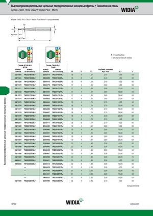 Высокопроизводительные цельные твердосплавные концевые фрезы Высокопроизводительные цельные твердосплавные концевые фрезы • Закаленная сталь Серия 7N02 7N12 7N22• Vision Plus™ Micro (Серии 7N02 7N12 7N22 • Vision Plus Micro — продолжение) L3 ⅷ лучший выбор ࠗ альтернативный выбор СплAаlвTiANlT-MiNJ-1MJ1 СплTаiвAlTNiA-RlNJ-1RJ1 AlTiN TiAlN номер номер номер номер глубина резания заказа по каталогу заказа по каталогу D1 D D3 Ap1 max L3 L 3321565 7N2201601MJ 2256474 7N2201601RJ 1,6 4 1,57 2,40 6,00 50 3321524 7N0201602MJ 2256399 7N0201602RJ 1,6 6 1,54 2,40 4,00 50 3321528 7N1201602MJ 2256410 7N1201602RJ 1,6 6 1,54 2,40 8,00 60 3321570 7N2201701MJ 2256479 7N2201701RJ 1,7 4 1,64 2,60 6,00 50 3321571 7N2201711MJ 2256480 7N2201711RJ 1,7 4 1,64 2,60 10,00 50 3321572 7N2201721MJ 2256481 7N2201721RJ 1,7 4 1,64 2,60 12,00 50 3321573 7N2201731MJ 2256482 7N2201731RJ 1,7 4 1,64 2,60 16,00 50 3321574 7N2201741MJ 2256483 7N2201741RJ 1,7 4 1,64 2,60 20,00 63 3321575 7N2201801MJ 2256484 7N2201801RJ 1,8 4 1,74 2,70 6,00 50 3321576 7N2201811MJ 2256485 7N2201811RJ 1,8 4 1,74 2,70 10,00 50 3321577 7N2201821MJ 2256486 7N2201821RJ 1,8 4 1,74 2,70 12,00 50 3321578 7N2201831MJ 2256487 7N2201831RJ 1,8 4 1,74 2,70 16,00 50 3321579 7N2201841MJ 2256488 7N2201841RJ 1,8 4 1,74 2,70 20,00 63 3321525 7N0201802MJ 2256400 7N0201802RJ 1,8 6 1,74 2,70 4,50 50 3089254 7N1201802MJ 2256411 7N1201802RJ 1,8 6 1,74 2,70 9,00 60 3321580 7N2201901MJ 2256489 7N2201901RJ 1,9 4 1,84 2,80 6,00 50 3321581 7N2201911MJ 2256490 7N2201911RJ 1,9 4 1,84 2,80 10,00 50 3321582 7N2201921MJ 2256491 7N2201921RJ 1,9 4 1,84 2,80 12,00 50 3321583 7N2201931MJ 2256492 7N2201931RJ 1,9 4 1,84 2,80 16,00 50 3321584 7N2201941MJ 2256493 7N2201941RJ 1,9 4 1,84 2,80 20,00 63 3321585 7N2202001MJ 2256494 7N2202001RJ 2,0 4 1,96 3,00 6,00 50 3321586 7N2202011MJ 2256495 7N2202011RJ 2,0 4 1,96 3,00 10,00 50 3321587 7N2202021MJ 2256496 7N2202021RJ 2,0 4 1,96 3,00 16,00 50 3321588 7N2202031MJ 2256497 7N2202031RJ 2,0 4 1,96 3,00 20,00 63 3321589 7N2202041MJ 2256498 7N2202041RJ 2,0 4 1,96 3,00 20,00 75 3089247 7N0202002MJ 2256401 7N0202002RJ 2,0 6 1,96 3,00 5,00 50 3089255 7N1202002MJ 2256412 7N1202002RJ 2,0 6 1,96 3,00 10,00 60 — 3454429 7N2202051RJ 2,1 4 2,00 3,00 8,00 50 — 3454430 7N2202061RJ 2,1 4 2,00 3,00 12,00 50 — 3454431 7N2202071RJ 2,1 4 2,00 3,00 14,00 50 — 3454432 7N2202091RJ 2,1 4 2,00 3,00 25,00 63 3321590 7N2202501MJ 2256499 7N2202501RJ 2,5 4 2,40 3,70 8,00 50 (продолжение) O162 widia.com