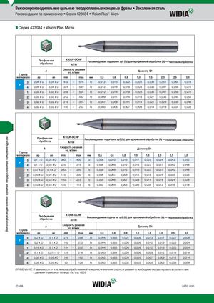Высокопроизводительные цельные твердосплавные концевые фрезы Высокопроизводительные цельные твердосплавные концевые фрезы • Закаленная сталь Рекомендации по применению • Серия 423034 • Vision Plus™ Micro Серия 423034 • Vision Plus Micro Профильнаяобработка K10UF-DCHP Рекомендуемая подача на зуб (fz) для профильной обработки (A) — Чистовая обработкаAlTiN A Скорость резанияvc, м/мин Диаметр D1 Группа материала ap ae min max мм 0,5 0,6 0,8 1,0 1,5 2,0 2,5 3,0 3 0,04 x D 0,04 x D 432 - 576 fz 0,012 0,015 0,020 0,025 0,038 0,051 0,064 0,078 P 4 0,04 x D 0,04 x D 324 - 540 fz 0,012 0,014 0,019 0,023 0,035 0,047 0,059 0,072 1 0,03 x D 0,03 x D 288 - 504 fz 0,012 0,014 0,019 0,023 0,035 0,047 0,059 0,072 2 0,03 x D 0,03 x D 252 - 432 fz 0,009 0,011 0,014 0,018 0,027 0,036 0,045 0,054 H 3 0,02 x D 0,02 x D 216 - 324 fz 0,007 0,008 0,011 0,014 0,021 0,028 0,035 0,043 4 0,02 x D 0,02 x D 180 - 252 fz 0,005 0,006 0,007 0,009 0,014 0,019 0,024 0,028 Профильнаяобработка K10UF-DCHP Рекомендуемая подача на зуб (fz) для профильной обработки (A) — Получистовая обработкаAlTiN A Скорость резанияvc, м/мин Диаметр D1 Группа материала ap ae min max мм 0,5 0,6 0,8 1,0 1,5 2,0 2,5 3,0 3 0,1 x D 0,05 x D 300 - 400 fz 0,008 0,010 0,013 0,017 0,025 0,034 0,043 0,052 P 4 0,1 x D 0,05 x D 225 - 375 fz 0,008 0,009 0,012 0,016 0,023 0,031 0,040 0,048 1 0,07 x D 0,1 x D 200 - 350 fz 0,008 0,009 0,012 0,016 0,023 0,031 0,040 0,048 2 0,05 x D 0,04 x D 175 - 300 fz 0,006 0,007 0,009 0,012 0,018 0,024 0,030 0,036 H 3 0,03 x D 0,03 x D 150 - 225 fz 0,005 0,006 0,007 0,009 0,014 0,019 0,024 0,028 4 0,03 x D 0,03 x D 125 - 175 fz 0,003 0,004 0,005 0,006 0,009 0,012 0,016 0,019 Профильнаяобработка K10UF-DCHP Рекомендуемая подача на зуб (fz) для профильной обработки (A) — Черновая обработкаAlTiN A Скорость резанияvc, м/мин Диаметр D1 Группа материала ap ae min max мм 0,5 0,6 0,8 1,0 1,5 2,0 2,5 3,0 3 0,2 x D 0,1 x D 216 - 288 fz 0,004 0,005 0,007 0,008 0,013 0,017 0,021 0,026 P 4 0,2 x D 0,1 x D 162 - 270 fz 0,004 0,005 0,006 0,008 0,012 0,016 0,020 0,024 1 0,15 x D 0,1 x D 144 - 252 fz 0,004 0,005 0,006 0,008 0,012 0,016 0,020 0,024 2 0,1 x D 0,075 x D 126 - 216 fz 0,003 0,004 0,005 0,006 0,009 0,012 0,015 0,018 H 3 0,05 x D 0,05 x D 108 - 162 fz 0,002 0,003 0,004 0,005 0,007 0,009 0,012 0,014 4 0,05 x D 0,05 x D 90 - 126 fz 0,002 0,002 0,002 0,003 0,005 0,006 0,008 0,009 ПРИМЕЧАНИЕ. В зависимости от угла наклона обрабатываемой поверхности значение скорости резания vc необходимо скорректировать в соответствии с данными справочной таблицы. См. стр. O205. O168 widia.com