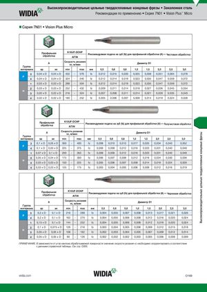 Высокопроизводительные цельные твердосплавные концевые фрезы Высокопроизводительные цельные твердосплавные концевые фрезы • Закаленная сталь Рекомендации по применению • Серия 7N01 • Vision Plus™ Micro Серия 7N01 • Vision Plus Micro Профильнаяобработка K10UF-DCHP Рекомендуемая подача на зуб (fz) для профильной обработки (A) — Чистовая обработкаAlTiN A Скорость резанияvc, м/мин Диаметр D1 Группа материала ap ae min max мм 0,5 0,6 0,8 1,0 1,5 2,0 2,5 3,0 3 0,04 x D 0,04 x D 432 - 576 fz 0,012 0,015 0,020 0,025 0,038 0,051 0,064 0,078 P 4 0,04 x D 0,04 x D 324 - 540 fz 0,012 0,014 0,019 0,023 0,035 0,047 0,059 0,072 1 0,03 x D 0,03 x D 288 - 504 fz 0,012 0,014 0,019 0,023 0,035 0,047 0,059 0,072 2 0,03 x D 0,03 x D 252 - 432 fz 0,009 0,011 0,014 0,018 0,027 0,036 0,045 0,054 H 3 0,02 x D 0,02 x D 216 - 324 fz 0,007 0,008 0,011 0,014 0,021 0,028 0,035 0,043 4 0,02 x D 0,02 x D 180 - 252 fz 0,005 0,006 0,007 0,009 0,014 0,019 0,024 0,028 Профильнаяобработка K10UF-DCHP Рекомендуемая подача на зуб (fz) для профильной обработки (A) — Получистовая обработкаAlTiN A Скорость резанияvc, м/мин Диаметр D1 Группа материала ap ae min max мм 0,5 0,6 0,8 1,0 1,5 2,0 2,5 3,0 3 0,1 x D 0,05 x D 300 - 400 fz 0,008 0,010 0,013 0,017 0,025 0,034 0,043 0,052 P 4 0,1 x D 0,05 x D 225 - 375 fz 0,008 0,009 0,012 0,016 0,023 0,031 0,040 0,048 1 0,07 x D 0,1 x D 200 - 350 fz 0,008 0,009 0,012 0,016 0,023 0,031 0,040 0,048 2 0,05 x D 0,04 x D 175 - 300 fz 0,006 0,007 0,009 0,012 0,018 0,024 0,030 0,036 H 3 0,03 x D 0,03 x D 150 - 225 fz 0,005 0,006 0,007 0,009 0,014 0,019 0,024 0,028 4 0,03 x D 0,03 x D 125 - 175 fz 0,003 0,004 0,005 0,006 0,009 0,012 0,016 0,019 Профильнаяобработка K10UF-DCHP Рекомендуемая подача на зуб (fz) для профильной обработки (A) — Черновая обработкаAlTiN A Скорость резанияvc, м/мин Диаметр D1 Группа материала ap ae min max мм 0,5 0,6 0,8 1,0 1,5 2,0 2,5 3,0 3 0,2 x D 0,1 x D 216 - 288 fz 0,004 0,005 0,007 0,008 0,013 0,017 0,021 0,026 P 4 0,2 x D 0,1 x D 162 - 270 fz 0,004 0,005 0,006 0,008 0,012 0,016 0,020 0,024 1 0,15 x D 0,1 x D 144 - 252 fz 0,004 0,005 0,006 0,008 0,012 0,016 0,020 0,024 2 0,1 x D 0,075 x D 126 - 216 fz 0,003 0,004 0,005 0,006 0,009 0,012 0,015 0,018 H 3 0,05 x D 0,05 x D 108 - 162 fz 0,002 0,003 0,004 0,005 0,007 0,009 0,012 0,014 4 0,05 x D 0,05 x D 90 - 126 fz 0,002 0,002 0,002 0,003 0,005 0,006 0,008 0,009 ПРИМЕЧАНИЕ. В зависимости от угла наклона обрабатываемой поверхности значение скорости резания vc необходимо скорректировать в соответствии с данными справочной таблицы. См. стр. O205. widia.com O169