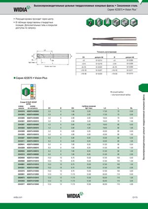 Высокопроизводительные цельные твердосплавные концевые фрезы Высокопроизводительные цельные твердосплавные концевые фрезы • Закаленная сталь Серия 422875 • Vision Plus™ • Режущая кромка проходит через центр. • В таблицах представлены стандартные позиции. Дополнительные типы и покрытия доступны по запросу. Tочность изготовления D1 допуск h8 D допуск h6 )3 0/-0,014 )3 0/-0,006 >3–6 0/-0,018 >3–6 0/-0,008 более чем 4 мм >6–10 0/-0,022 >6–10 0/-0,009 >10–18 0/-0,027 >10–18 0/-0,011 >18–30 0/-0,033 >18–30 0/-0,013 Серия 422875 • Vision Plus ⅷ лучший выбор ࠗ альтернативный выбор СплKа1в0KU1F0-UDFC-HDPCHP AlTiN номер номер глубина резания заказа по каталогу D1 D D3 Ap1 max L3 L R¡ 2343319 422875-002003 2,0 6 1,90 2,00 17,50 70 0,30 2343303 422875-002005 2,0 6 1,90 2,00 17,50 70 0,50 2343305 422875-003005 3,0 6 2,90 3,00 18,50 70 0,50 2343321 422875-003010 3,0 6 2,90 3,00 18,50 70 1,00 2343307 422875-004005 4,0 6 3,80 4,00 19,50 80 0,50 2343323 422875-004010 4,0 6 3,80 4,00 19,50 80 1,00 2343309 422875-005005 5,0 6 4,80 5,00 42,00 80 0,50 2343325 422875-005010 5,0 6 4,80 5,00 42,00 80 1,00 2343327 422875-006005 6,0 6 5,80 6,00 42,00 80 0,50 2343311 422875-006010 6,0 6 5,80 6,00 42,00 80 1,00 2629541 422875-008005 8,0 8 7,80 8,00 51,00 90 0,50 2343329 422875-008010 8,0 8 7,80 8,00 51,00 90 1,00 2629555 422875-008015 8,0 8 7,80 8,00 51,00 90 1,50 2343313 422875-008020 8,0 8 7,80 8,00 51,00 90 2,00 2629559 422875-010005 10,0 10 9,70 10,00 57,00 100 0,50 2629560 422875-010010 10,0 10 9,70 10,00 57,00 100 1,00 3048961 422875-010015 10,0 10 9,70 10,00 57,00 100 1,50 2343331 422875-010020 10,0 10 9,70 10,00 57,00 100 2,00 2343315 422875-010030 10,0 10 9,70 10,00 57,00 100 3,00 2629561 422875-012005 12,0 12 11,70 12,00 62,00 110 0,50 2629573 422875-012010 12,0 12 11,70 12,00 62,00 110 1,00 2343333 422875-012030 12,0 12 11,70 12,00 62,00 110 3,00 2343317 422875-012040 12,0 12 11,70 12,00 62,00 110 4,00 widia.com O173