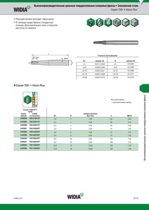 Высокопроизводительные цельные твердосплавные концевые фрезы Высокопроизводительные цельные твердосплавные концевые фрезы • Закаленная сталь Серия 7061 • Vision Plus™ • Режущая кромка проходит через центр. • В таблицах представлены стандартные позиции. Дополнительные типы и покрытия доступны по запросу. Tочность изготовления D1 допуск e8 D допуск h6 )3 -0,014/-0,028 )3 0/-0,006 >3–6 -0,020/-0,038 >3–6 0/-0,008 >6–10 -0,025/-0,047 >6–10 0/-0,009 >10–18 -0,032/-0,059 >10–18 0/-0,011 >18–30 -0,040/-0,073 >18–30 0/-0,013 Серия 7061 • Vision Plus ⅷ лучший выбор ࠗ альтернативный выбор СплTаiAвlNTiA- lRNT-1RT1 TiAlN номер номер глубина резания заказа по каталогу D1 D Ap1 max L BETA 2495994 706101001RT 1,0 4 1,00 63 3.50 2495995 706102001RT 2,0 4 2,00 63 3.50 2495996 706102501RT 2,5 4 2,50 63 3.00 2495997 706103002RT 3,0 6 3,00 75 1.50 2495998 706104002RT 4,0 6 4,00 75 1.50 2495999 706105002RT 5,0 6 5,00 75 1.50 2496000 706106004RT 6,0 10 6,00 100 1.50 2496001 706108004RT 8,0 10 8,00 100 1.50 2496002 706110005RT 10,0 12 10,00 125 1.50 2496023 706112006RT 12,0 16 12,00 125 1.50 widia.com O175