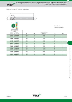 Высокопроизводительные цельные твердосплавные концевые фрезы Высокопроизводительные цельные твердосплавные концевые фрезы • Закаленная сталь Серии 7505 7515 7525 7545 • Vision Plus™ (Серии 7505 7515 7525 7545 • Vision Plus — продолжение) L D1 D ⅷ лучший выбор ࠗ альтернативный выбор СплTаiAвlNTiA- lLNT-1LT1 TiAlN номер номер глубина резания заказа по каталогу D1 D Ap1 max L ZU 1724531 752512005LT 12,0 12 42,00 125 6 1860606 754516006LT 16,0 16 24,00 89 4 1724466 750516006LT 16,0 16 24,00 125 4 1724483 751516006LT 16,0 16 40,00 125 6 1724533 752516006LT 16,0 16 56,00 125 6 1860607 754520007LT 20,0 20 30,00 104 4 1724467 750520007LT 20,0 20 30,00 150 4 1724484 751520007LT 20,0 20 50,00 150 6 1724536 752520007LT 20,0 20 70,00 150 6 1860608 754525008LT 25,0 25 38,00 121 5 1731683 750525008LT 25,0 25 38,00 150 5 1747878 751525008LT 25,0 25 63,00 150 6 1747931 752525008LT 25,0 25 88,00 150 6 widia.com O181