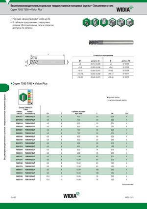 Высокопроизводительные цельные твердосплавные концевые фрезы Высокопроизводительные цельные твердосплавные концевые фрезы • Закаленная сталь Серии 7585 7595 • Vision Plus™ • Режущая кромка проходит через центр. • В таблицах представлены стандартные позиции. Дополнительные типы и покрытия доступны по запросу. Tочность изготовления D1 допуск e8 D допуск h6 )3 -0,014/-0,028 )3 0/-0,006 >3–6 -0,020/-0,038 >3–6 0/-0,008 >6–10 -0,025/-0,047 >6–10 0/-0,009 >10–18 -0,032/-0,059 >10–18 0/-0,011 >18–30 -0,040/-0,073 >18–30 0/-0,013 Серии 7585 7595 • Vision Plus ⅷ лучший выбор ࠗ альтернативный выбор СплTаiAвlNTiA- lLNT-1LT1 TiAlN номер номер глубина резания заказа по каталогу D1 D Ap1 max L R¡ ZU 2540317 759503002LT 3,0 6 4,50 50 0,25 4 2540318 759503012LT 3,0 6 4,50 50 0,50 4 2540319 759504002LT 4,0 6 6,00 50 0,25 4 2540320 759504012LT 4,0 6 6,00 50 0,50 4 2540321 759505002LT 5,0 6 7,50 50 0,25 4 2540322 759505012LT 5,0 6 7,50 50 0,50 4 1862105 759506002LT 6,0 6 9,00 50 0,25 4 1862106 759506012LT 6,0 6 9,00 50 0,50 4 2541273 759506022LT 6,0 6 9,00 50 0,75 4 2541274 759506032LT 6,0 6 9,00 50 1,00 4 1860609 758506002LT 6,0 6 9,00 76 0,25 4 1860610 758506012LT 6,0 6 9,00 76 0,50 4 1862107 759508003LT 8,0 8 12,00 63 0,50 4 2541275 759508023LT 8,0 8 12,00 63 0,75 4 1862108 759508013LT 8,0 8 12,00 63 1,00 4 2541276 759508033LT 8,0 8 12,00 63 1,50 4 1860611 758508003LT 8,0 8 12,00 100 0,50 4 1860612 758508013LT 8,0 8 12,00 100 1,00 4 1862109 759510004LT 10,0 10 15,00 76 0,50 4 1862110 759510014LT 10,0 10 15,00 76 1,00 4 (продолжение) O182 widia.com