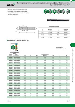 Высокопроизводительные цельные твердосплавные концевые фрезы Высокопроизводительные цельные твердосплавные концевые фрезы • Закаленная сталь Серии 422876 422878 • Vision Plus™ • Режущая кромка проходит через центр. • В таблицах представлены стандартные позиции. Дополнительные типы и покрытия доступны по запросу. Tочность изготовления D1 допуск h8 D допуск h6 )3 0/-0,014 )3 0/-0,006 >3–6 0/-0,018 >3–6 0/-0,008 >6–10 0/-0,022 >6–10 0/-0,009 >10–18 0/-0,027 >10–18 0/-0,011 >18–30 0/-0,033 >18–30 0/-0,013 Серии 422876 422878 • Vision Plus ⅷ лучший выбор ࠗ альтернативный выбор СплKа1в0KU1F0-UDFC-HDPCHP AlTiN номер номер глубина резания заказа по каталогу D1 D D3 Ap1 max L3 L R¡ 2628898 422876-004005 4,0 6 3,80 4,00 10,00 45 0,50 2629013 422876-004010 4,0 6 3,80 4,00 10,00 45 1,00 2629015 422876-005005 5,0 6 4,80 5,00 12,00 50 0,50 2629016 422876-005010 5,0 6 4,80 5,00 12,00 50 1,00 2629018 422876-006005 6,0 6 5,80 6,00 12,00 50 0,50 2629021 422876-006010 6,0 6 5,80 6,00 12,00 50 1,00 2630276 422878-006005 6,0 6 5,80 6,00 42,00 80 0,50 2629056 422876-008005 8,0 8 7,80 8,00 20,00 60 0,50 2629060 422876-008010 8,0 8 7,80 8,00 20,00 60 1,00 2629061 422876-008020 8,0 8 7,80 8,00 20,00 60 2,00 2630285 422878-008010 8,0 8 7,80 8,00 51,00 90 1,00 2630288 422878-008015 8,0 8 7,80 8,00 51,00 90 1,50 2630290 422878-008020 8,0 8 7,80 8,00 51,00 90 2,00 2629062 422876-010005 10,0 10 9,80 10,00 26,00 70 0,50 2629077 422876-010010 10,0 10 9,80 10,00 26,00 70 1,00 2629086 422876-010020 10,0 10 9,80 10,00 26,00 70 2,00 2630291 422878-010005 10,0 10 9,70 10,00 57,00 100 0,50 2630292 422878-010010 10,0 10 9,70 10,00 57,00 100 1,00 2630345 422878-010020 10,0 10 9,70 10,00 57,00 100 2,00 2629089 422876-012005 12,0 12 11,80 12,00 26,00 75 0,50 2629094 422876-012010 12,0 12 11,80 12,00 26,00 75 1,00 2629095 422876-012020 12,0 12 11,80 12,00 26,00 75 2,00 2629097 422876-012030 12,0 12 11,80 12,00 26,00 75 3,00 2630347 422878-012010 12,0 12 11,70 12,00 62,00 110 1,00 2630386 422878-012030 12,0 12 11,70 12,00 62,00 110 3,00 widia.com O187