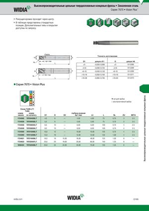 Высокопроизводительные цельные твердосплавные концевые фрезы Высокопроизводительные цельные твердосплавные концевые фрезы • Закаленная сталь Серия 7670 • Vision Plus™ • Режущая кромка проходит через центр. • В таблицах представлены стандартные позиции. Дополнительные типы и покрытия доступны по запросу. Tочность изготовления D1 допуск d11 D допуск h6 )3 -0,020/-0,080 )3 0/-0,006 >3–6 -0,030/-0,105 >3–6 0/-0,008 >6–10 -0,040/-0,130 >6–10 0/-0,009 >10–18 -0,050/-0,160 >10–18 0/-0,011 >18–30 -0,065/-0,195 >18–30 0/-0,013 Серия 7670 • Vision Plus ⅷ лучший выбор ࠗ альтернативный выбор СплTаiAвlNTiA- lLNT-1LT1 TiAlN номер номер глубина резания заказа по каталогу D1 D D3 Ap1 max L3 L R¡ ZU BETA 1724582 767004002LT 4,0 6 — 4,00 4,00 75 0,75 3 2.5 1724556 767005002LT 5,0 6 — 5,00 5,00 75 0,75 3 2.5 1724558 767006004LT 6,0 10 — 6,00 6,00 100 0,75 4 2.5 1724559 767008004LT 8,0 10 — 8,00 8,00 100 0,75 4 2.5 1724560 767010005LT 10,0 12 — 10,00 10,00 125 0,75 4 2.5 1724590 767012006LT 12,0 16 — 12,00 12,00 125 1,00 4 2.5 1724621 767016006LT 16,0 16 15,00 16,00 48,00 125 1,00 6 — 1724622 767020007LT 20,0 20 19,00 20,00 60,00 150 1,25 6 — 1806404 767025008LT 25,0 25 24,00 25,00 75,00 150 1,25 6 — widia.com O193
