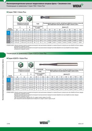Высокопроизводительные цельные твердосплавные концевые фрезы Высокопроизводительные цельные твердосплавные концевые фрезы • Закаленная сталь Рекомендации по применению • Серия 75N2 • Vision Plus™ Серия 75N2 • Vision Plus Обработка уступов (A)и обработка пазов (B)TiAlN Рекомендуемая подача на зуб (fz = мм/зуб) для обработки уступов и стенок (A).Для прорезания пазов (B) подачу fz следует снизить на 20%. AГруппа B Скорость резанияvc, м/мин Диаметр D1 материала ap ae ap min max мм 3,0 4,0 5,0 6,0 8,0 10,0 12,0 3 0,75 x D 0,1 x D 0,4 x D 160 – 180 fz 0,017 0,023 0,030 0,036 0,050 0,061 0,070 P 4 0,75 x D 0,1 x D 0,4 x D 140 – 160 fz 0,016 0,021 0,027 0,033 0,045 0,054 0,062 1 0,75 x D 0,1 x D 0,4 x D 120 – 140 fz 0,016 0,021 0,027 0,033 0,045 0,054 0,062 2 0,75 x D 0,05 x D 0,3 x D 100 – 130 fz 0,016 0,020 0,025 0,029 0,034 0,037 0,040 H 3 0,75 x D 0,03 x D 0,2 x D 70 – 100 fz 0,013 0,016 0,019 0,023 0,026 0,029 0,032 4 0,75 x D 0,01 x D 0,1 x D 50 – 70 fz 0,008 0,011 0,013 0,015 0,018 0,019 0,021 ПРИМЕЧАНИЕ. Нижнее значение скорости резания используется при выполнении операций со съемом большого припуска или при обработке более твердых материалов в пределах группы. Верхнее значение скорости резания используется при выполнении операций чистовой обработки или при обработке менее твердых материалов в пределах группы. Рекомендации по применению • Серия 422875 • Vision Plus Серия 422875 • Vision Plus Обработка уступов (A) K10UF-DCHP Рекомендуемая подача на зуб (fz = мм/зуб) для обработки уступов и стенок (A). и обработка пазов (B) AlTiN Для прорезания пазов (B) подачу fz следует снизить на 20%. AГруппа B Скорость резанияvc, м/мин Диаметр D1 материала ap ae ap min max мм 3,0 4,0 5,0 6,0 8,0 10,0 12,0 3 0,5 x D 0,4 x D 0,3 x D 108 – 144 fz 0,017 0,023 0,030 0,036 0,050 0,061 0,070 P 4 0,5 x D 0,4 x D 0,3 x D 81 – 135 fz 0,016 0,021 0,027 0,033 0,045 0,054 0,062 1 0,5 x D 0,4 x D 0,3 x D 72 – 126 fz 0,016 0,021 0,027 0,033 0,045 0,054 0,062 2 0,5 x D 0,3 x D 0,2 x D 63 – 108 fz 0,012 0,016 0,020 0,025 0,034 0,040 0,047 H 3 0,5 x D 0,15 x D 0,15 x D 54 – 81 fz 0,009 0,013 0,016 0,019 0,026 0,032 0,037 4 0,5 x D 0,1 x D 0,1 x D 45 – 63 fz 0,006 0,008 0,011 0,013 0,018 0,021 0,025 ПРИМЕЧАНИЕ. Нижнее значение скорости резания используется при выполнении операций со съемом большого припуска или при обработке более твердых материалов в пределах группы. Верхнее значение скорости резания используется при выполнении операций чистовой обработки или при обработке менее твердых материалов в пределах группы. При соотношении ap/ae, равном 0,05 x D, следует снизить подачу fz на 40%. Для повышения качества обработанной поверхности следует снизить подачу на зуб. O194 widia.com