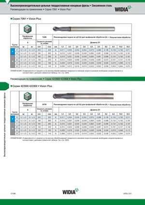 Высокопроизводительные цельные твердосплавные концевые фрезы Высокопроизводительные цельные твердосплавные концевые фрезы • Закаленная сталь Рекомендации по применению • Серия 70N1 • Vision Plus™ Серия 70N1 • Vision Plus Профильнаяобработка TiAlN Рекомендуемая подача на зуб (fz) для профильной обработки (A) — Получистовая обработка A Скорость резанияvc, м/мин Диаметр D1 Группа материала ap ae min max мм 1,0 2,0 2,5 3,0 4,0 5,0 6,0 8,0 10,0 12,0 3 0,1 x D 0,1 x D 240 – 320 fz 0,017 0,034 0,043 0,052 0,070 0,089 0,109 0,150 0,182 0,211 P 4 0,1 x D 0,1 x D 180 – 300 fz 0,016 0,031 0,040 0,048 0,064 0,081 0,099 0,134 0,162 0,187 1 0,1 x D 0,1 x D 160 – 280 fz 0,016 0,031 0,040 0,048 0,064 0,081 0,099 0,134 0,162 0,187 2 0,1 x D 0,1 x D 140 – 240 fz 0,012 0,024 0,030 0,036 0,048 0,061 0,074 0,101 0,121 0,140 H 3 0,1 x D 0,1 x D 120 – 180 fz 0,009 0,019 0,024 0,028 0,038 0,048 0,058 0,079 0,096 0,112 4 0,1 x D 0,1 x D 100 – 140 fz 0,006 0,012 0,016 0,019 0,025 0,032 0,039 0,053 0,064 0,074 ПРИМЕЧАНИЕ. В зависимости от среднего угла наклона обрабатываемой поверхности значение скорости резания необходимо скорректировать в соответствии с данными справочной таблицы. См. стр. O205. Рекомендации по применению • Серии 422869 422868 • Vision Plus Серии 422869 422868 • Vision Plus Профильнаяобработка AlTiN Рекомендуемая подача на зуб (fz) для профильной обработки (A) — Получистовая обработка A Скорость резанияvc, м/мин Диаметр D1 Группа материала ap ae min max мм 1,0 2,0 2,5 3,0 4,0 5,0 6,0 8,0 10,0 12,0 3 0,1 x D 0,1 x D 240 – 320 fz 0,017 0,034 0,043 0,052 0,070 0,089 0,109 0,150 0,182 0,211 P 4 0,1 x D 0,1 x D 180 – 300 fz 0,016 0,031 0,040 0,048 0,064 0,081 0,099 0,134 0,162 0,187 1 0,1 x D 0,1 x D 160 – 280 fz 0,016 0,031 0,040 0,048 0,064 0,081 0,099 0,134 0,162 0,187 2 0,1 x D 0,1 x D 140 – 240 fz 0,012 0,024 0,030 0,036 0,048 0,061 0,074 0,101 0,121 0,140 H 3 0,1 x D 0,1 x D 120 – 180 fz 0,009 0,019 0,024 0,028 0,038 0,048 0,058 0,079 0,096 0,112 4 0,1 x D 0,1 x D 100 – 140 fz 0,006 0,012 0,016 0,019 0,025 0,032 0,039 0,053 0,064 0,074 ПРИМЕЧАНИЕ. В зависимости от среднего угла наклона обрабатываемой поверхности значение скорости резания необходимо скорректировать в соответствии с данными справочной таблицы. См. стр. О205. O196 widia.com