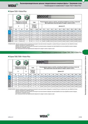 Высокопроизводительные цельные твердосплавные концевые фрезы Высокопроизводительные цельные твердосплавные концевые фрезы • Закаленная сталь Рекомендации по применению • Серия 7525 • Vision Plus™ Серия 7525 • Vision Plus Обработка уступов (A)и обработка пазов (B)TiAlN Рекомендуемая подача на зуб (fz = мм/зуб) для обработки уступов и стенок (A).Для прорезания пазов (B) подачу fz следует снизить на 20%. Скорость Группа Aмате- B резанияvc, м/мин Диаметр D1 риала ap ae ap min max мм 3,0 4,0 5,0 6,0 8,0 10,0 12,0 16,0 20,0 25,0 3 3xD 0,2 x D 0,5 x D 160 – 180 fz 0,019 0,026 0,033 0,040 0,055 0,067 0,077 0,096 0,111 0,125 P 4 3xD 0,2 x D 0,3 x D 140 – 160 fz 0,017 0,024 0,030 0,036 0,049 0,059 0,069 0,084 0,097 0,107 1 3xD 0,2 x D 0,3 x D 120 – 140 fz 0,017 0,024 0,030 0,036 0,049 0,059 0,069 0,084 0,097 0,107 2 3xD 0,15 x D 0,2 x D 80 – 130 fz 0,013 0,018 0,022 0,027 0,037 0,044 0,051 0,063 0,071 0,078 H 3 3xD 0,05 x D – 70 – 100 fz 0,010 0,014 0,018 0,021 0,029 0,035 0,041 0,051 0,059 0,067 4 3xD 0,03 x D – 50 – 70 fz 0,007 0,009 0,012 0,014 0,019 0,023 0,027 0,034 0,039 0,044 ПРИМЕЧАНИЕ. Нижнее значение скорости резания используется при выполнении операций со съемом большого припуска или при обработке более твердых материалов в пределах группы. Верхнее значение скорости резания используется при выполнении операций чистовой обработки или при обработке менее твердых материалов в пределах группы. Для повышения качества обработанной поверхности следует снизить подачу на зуб. Рекомендации по применению • Серии 7585 7595 • Vision Plus Серии 7585 7595 • Vision Plus Обработка уступов (A)и обработка пазов (B)TiAlN Рекомендуемая подача на зуб (fz = мм/зуб) для обработки уступов и стенок (A).Для прорезания пазов (B) подачу fz следует снизить на 20%. Скорость Группа Aмате- B резанияvc, м/мин Диаметр D1 риала ap ae ap min max мм 4,0 5,0 6,0 8,0 10,0 12,0 14,0 16,0 18,0 20,0 25,0 3 1xD 0,4 x D 1xD 120 – 160 fz 0,019 0,033 0,040 0,055 0,067 0,077 0,077 0,096 0,096 0,111 0,125 P 4 1xD 0,4 x D 0,75 x D 90 – 150 fz 0,017 0,030 0,036 0,049 0,059 0,069 0,069 0,084 0,084 0,097 0,107 1 1xD 0,4 x D 0,75 x D 80 – 140 fz 0,017 0,030 0,036 0,049 0,059 0,069 0,069 0,084 0,084 0,097 0,107 2 1xD 0,3 x D 0,5 x D 70 – 120 fz 0,013 0,022 0,027 0,037 0,044 0,051 0,051 0,063 0,063 0,071 0,078 H 3 1xD 0,15 x D 0,3 x D 60 – 90 fz 0,010 0,018 0,021 0,029 0,035 0,041 0,041 0,051 0,051 0,059 0,067 4 1xD 0,1 x D 0,15 x D 50 – 70 fz 0,007 0,012 0,014 0,019 0,023 0,027 0,027 0,034 0,034 0,039 0,044 ПРИМЕЧАНИЕ. Нижнее значение скорости резания используется при выполнении операций со съемом большого припуска или при обработке более твердых материалов в пределах группы. Верхнее значение скорости резания используется при выполнении операций чистовой обработки или при обработке менее твердых материалов в пределах группы. Для повышения качества обработанной поверхности следует снизить подачу на зуб. widia.com O199