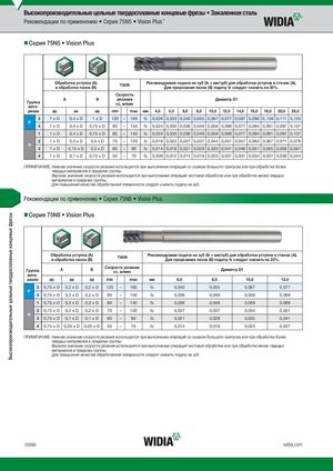 Высокопроизводительные цельные твердосплавные концевые фрезы Высокопроизводительные цельные твердосплавные концевые фрезы • Закаленная сталь Рекомендации по применению • Серия 75N5 • Vision Plus™ Серия 75N5 • Vision Plus Обработка уступов (A)и обработка пазов (B)TiAlN Рекомендуемая подача на зуб (fz = мм/зуб) для обработки уступов и стенок (A).Для прорезания пазов (B) подачу fz следует снизить на 20%. Скорость Группа Aмате- B резанияvc, м/мин Диаметр D1 риала ap ae ap min max мм 4,0 5,0 6,0 8,0 10,0 12,0 14,0 16,0 18,0 20,0 25,0 3 1xD 0,4 x D 1xD 120 – 160 fz 0,026 0,033 0,040 0,055 0,067 0,077 0,087 0,096 0.,104 0,111 0,125 P 4 1xD 0,4 x D 0,75 x D 90 – 150 fz 0,024 0,030 0,036 0,049 0,059 0,069 0,077 0,084 0,091 0,097 0,107 1 1xD 0,4 x D 0,75 x D 80 – 140 fz 0,024 0,030 0,036 0,049 0,059 0,069 0,077 0,084 0,091 0,097 0,107 2 1xD 0,3 x D 0,5 x D 70 – 120 fz 0,018 0,022 0,027 0,037 0,044 0,051 0,057 0,063 0,067 0,071 0,078 H 3 1xD 0,15 x D 0,3 x D 60 – 90 fz 0,014 0,018 0,021 0,029 0,035 0,041 0,046 0,051 0,055 0,059 0,067 4 1xD 0,1 x D 0,15 x D 50 – 70 fz 0,009 0,012 0,014 0,019 0,023 0,027 0,031 0,034 0,037 0,039 0,044 ПРИМЕЧАНИЕ. Нижнее значение скорости резания используется при выполнении операций со съемом большого припуска или при обработке более твердых материалов в пределах группы. Верхнее значение скорости резания используется при выполнении операций чистовой обработки или при обработке менее твердых материалов в пределах группы. Для повышения качества обработанной поверхности следует снизить подачу на зуб. Рекомендации по применению • Серия 75N8 • Vision Plus Серия 75N8 • Vision Plus Обработка уступов (A)и обработка пазов (B)TiAlN Рекомендуемая подача на зуб (fz = мм/зуб) для обработки уступов и стенок (A).Для прорезания пазов (B) подачу fz следует снизить на 20%. Группа A B Скорость резанияvc, м/мин Диаметр D1 мате- риала ap ap ap min max мм 6,0 8,0 10,0 12,0 3 0,75 x D 0,2 x D 0,2 x D 120 – 160 fz 0,040 0,055 0,067 0,077 P 4 0,75 x D 0,2 x D 0,2 x D 90 – 150 fz 0,036 0,049 0,059 0,069 1 0,75 x D 0,2 x D 0,2 x D 80 – 140 fz 0,036 0,049 0,059 0,069 2 0,75 x D 0,2 x D 0,2 x D 70 – 120 fz 0,027 0,037 0,044 0,051 H 3 0,75 x D 0,1 x D 0,1 x D 60 – 90 fz 0,021 0,029 0,035 0,041 4 0,75 x D 0,05 x D 0,05 x D 50 – 70 fz 0,014 0,019 0,023 0,027 ПРИМЕЧАНИЕ. Нижнее значение скорости резания используется при выполнении операций со съемом большого припуска или при обработке более твердых материалов в пределах группы. Верхнее значение скорости резания используется при выполнении операций чистовой обработки или при обработке менее твердых материалов в пределах группы. Для повышения качества обработанной поверхности следует снизить подачу на зуб. O200 widia.com