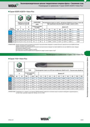 Высокопроизводительные цельные твердосплавные концевые фрезы Высокопроизводительные цельные твердосплавные концевые фрезы • Закаленная сталь Рекомендации по применению • Серии 422876 422878 • Vision Plus™ Серии 422876 422878 • Vision Plus Обработка уступов (A) K10UF-DCHP Рекомендуемая подача на зуб (fz = мм/зуб) для обработки уступов и стенок (A). и обработка пазов (B) AlTiN Для прорезания пазов (B) подачу fz следует снизить на 20%. AГруппа B Скорость резанияvc, м/мин Диаметр D1 материала ap ae ap min max мм 4,0 5,0 6,0 8,0 10,0 12,0 3 0,5 x D 0,4 x D 0,3 x D 120 – 160 fz 0,026 0,033 0,040 0,055 0,067 0,077 P 4 0,5 x D 0,4 x D 0,3 x D 90 – 150 fz 0,024 0,030 0,036 0,049 0,059 0,069 1 0,5 x D 0,4 x D 0,3 x D 80 – 140 fz 0,024 0,030 0,036 0,049 0,059 0,069 2 0,5 x D 0,3 x D 0,2 x D 60 – 80 fz 0,018 0,022 0,027 0,037 0,044 0,051 H 3 0,5 x D 0,15 x D 0,15 x D 50 – 70 fz 0,014 0,018 0,021 0,029 0,035 0,041 4 0,5 x D 0,1 x D 0,1 x D 40 – 60 fz 0,009 0,012 0,014 0,019 0,023 0,027 ПРИМЕЧАНИЕ. Нижнее значение скорости резания используется при выполнении операций со съемом большого припуска или при обработке более твердых материалов в пределах группы. Верхнее значение скорости резания используется при выполнении операций чистовой обработки или при обработке менее твердых материалов в пределах группы. Для ap/ae 0,05 x D следует снизить fz на 40%. Для повышения качества обработанной поверхности следует снизить подачу на зуб. Рекомендации по применению • Серия 7150 • Vision Plus Серия 7150 • Vision Plus Профильнаяобработка TiAlN Рекомендуемая подача на зуб (fz) для профильной обработки (A) — Получистовая обработка A Скорость резанияvc, м/мин Диаметр D1 Группа материала ap ae min max мм 1,0 2,0 2,5 3,0 4,0 5,0 6,0 8,0 10,0 12,0 3 0,1 x D 0,1 x D 240 – 320 fz 0,017 0,034 0,043 0,052 0,070 0,089 0,109 0,150 0,182 0,211 P 4 0,1 x D 0,1 x D 180 – 300 fz 0,016 0,031 0,040 0,048 0,064 0,081 0,099 0,134 0,162 0,187 1 0,1 x D 0,1 x D 160 – 280 fz 0,016 0,031 0,040 0,048 0,064 0,081 0,099 0,134 0,162 0,187 2 0,1 x D 0,1 x D 140 – 240 fz 0,012 0,024 0,030 0,036 0,048 0,061 0,074 0,101 0,121 0,140 H 3 0,1 x D 0,1 x D 120 – 180 fz 0,009 0,019 0,024 0,028 0,038 0,048 0,058 0,079 0,096 0,112 4 0,1 x D 0,1 x D 100 – 140 fz 0,006 0,012 0,016 0,019 0,025 0,032 0,039 0,053 0,064 0,074 ПРИМЕЧАНИЕ. В зависимости от среднего угла наклона обрабатываемой поверхности значение скорости резания необходимо скорректировать в соответствии с данными справочной таблицы. См. стр. O205. widia.com O201