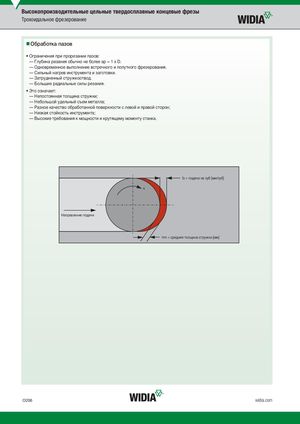 Высокопроизводительные цельные твердосплавные концевые фрезы Трохоидальное фрезерование Обработка пазов • Ограничения при прорезании пазов: — Глубина резания обычно не более ap = 1 x D. — Одновременное выполнение встречного и попутного фрезерования. — Сильный нагрев инструмента и заготовки. — Затрудненный стружкоотвод. — Большие радиальные силы резания. • Это означает: — Непостоянная толщина стружки; — Небольшой удельный съем металла; — Разное качество обработанной поверхности с левой и правой сторон; — Низкая стойкость инструмента; — Высокие требования к мощности и крутящему моменту станка. fz = подача на зуб [мм/зуб] n Направление подачи hm = средняя толщина стружки [мм] O206 widia.com