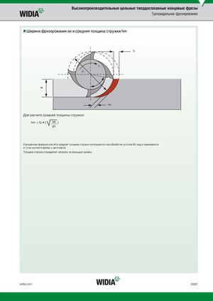 Высокопроизводительные цельные твердосплавные концевые фрезы Трохоидальное фрезерование Ширина фрезерования ae и средняя толщина стружки hm fz n d1 ae hm Для расчета средней толщины стружки: hm = fz • ( ae ) d1 Упрощённая формула расчёта средней толщины стружки используется при обработке уступов 90 град в зависимости от угла контакта фрезы с заготовкой. Толщина стружки определяет нагрузку на режущую кромку. widia.com O207