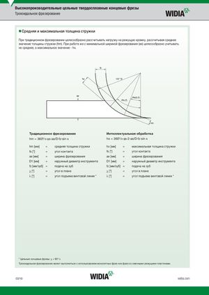 Высокопроизводительные цельные твердосплавные концевые фрезы Трохоидальное фрезерование Средняя и максимальная толщина стружки При традиционном фрезеровании целесообразно рассчитывать нагрузку на режущую кромку, рассчитывая среднее значение толщины стружки (hm). При работе же с минимальной шириной фрезерования (ae) целесообразно учитывать не среднее, а максимальное значение - hx. Традиционное фрезерование Интеллектуальная обработка hm = 360º//·qs·ae/D·fz·sin x hx = 360º//·qs·2·ae/D·fz·sin x hm [мм] = средняя толщина стружки hx [мм] = максимальная толщина стружки fs [°] = угол контакта fs [°] = угол контакта ae [мм] = ширина фрезерования ae [мм] = ширина фрезерования D1 [мм] = наружный диаметр инструмента D1 [мм] = наружный диаметр инструмента fz [мм/зуб] = подача на зуб fz [мм/зуб] = подача на зуб r [°] = угол в плане r [°] = угол в плане h [°] = угол подъема винтовой линии * h [°] = угол подъема винтовой линии * * Цельные концевые фрезы: r = 90°-h Трохоидальное фрезерование может выполняться с использованием монолитных фрез или фрез со сменными режущими пластинами. O210 widia.com