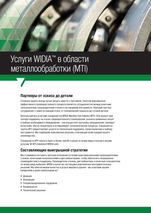 Услуги WIDIA™ в области металлообработки (MTI) Партнеры от эскиза до детали Сложные задачи всегда лучше решать вместе с партнером. Залогом максимально эффективного производственного процесса является сотрудничество между конечным пользователем, производителем станка и поставщиком инструмента. Хороший партнер сотрудничает с вами на каждом этапе, от планирования процесса до готовой детали. Воспользуйтесь услугами специалистов WIDIA Machine Tool Industry (MTI). Они окажут вам полную поддержку на этапах предварительного планирования, анализа временных затрат и выбора необходимого оборудования - они осуществят настройку оборудования, проведут испытания, обучат операторов и оптимизируют технологические процессы. Специалисты группы MTI предоставляют услуги по технической поддержке, проектированию и выбору инструмента. Мы подбираем комплексное решение, отвечающее всем нуждам вашего производства. Специалисты MTI присутствуют в более чем 60 странах по всему миру и всегда к вашим услугам: W-MTI.Solutions@WIDIA.com. Составляющие выигрышной стратегии Мы стремимся построить прочные отношения со всеми заинтересованными производителями станков, конечными пользователями и дистрибьюторами, чтобы обеспечить непрерывное взаимодействие и поддержку. Проиводители станков, дистрибьюторы и конечные пользователи по всему миру выбирают WIDIA в качестве поставщика комплексных инструментальных решений. Мы обеспечиваем качество и услуги мирового уровня - мы отвечаем вашим ожиданиям и даже превосходим их! • Доверие • Инновации • Специализированная поддержка • Возможности • Технические решения