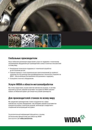 Глобальные производители Наша глобальная организация предоставляет услуги по поддержке и техническому сопровождению оборудования для производителей станков и конечных пользователей по всему миру. • Непрерывная техническая поддержка от технической проработки до изготовления детали. • Плавный переход от этапа первоначальных капиталовложений до серийного производства под руководством квалифицированных технических специалистов WIDIA™, обеспечивающих бесперебойное обслуживание и поддержку. • Оснащение станочного оборудования. Услуги WIDIA в области металлообработки Мы готовы предоставить нашим клиентам комплексное решение, от системы крепления до детали. Широкий ассортимент инструментов WIDIA позволяет выбрать оптимальный вариант для конкретных условий производства. Для производителей станков по всему миру Мы предлагаем производителям станков сотрудничество в сфере комплексных поставок оборудования: и мы обладаем широким ассортиментом конкурентоспособных технических решений, включающих стандартный и специальный металлорежущий инструмент. За дополнительной информацией обращайтесь к вашему региональному официальному дистрибьютору WIDIA или посетите сайт widia.com/services.
