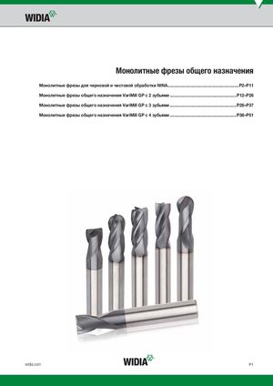 Монолитные фрезы общего назначения Монолитные фрезы для черновой и чистовой обработки NINA..............................................................P2–P11 Монолитные фрезы общего назначения VariMill GP с 2 зубьями ..........................................................P12–P26 Монолитные фрезы общего назначения VariMill GP с 3 зубьями ..........................................................P28–P37 Монолитные фрезы общего назначения VariMill GP с 4 зубьями ..........................................................P38–P51 widia.com P1
