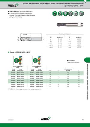 Цельные твердосплавные концевые фрезы общего назначения • Черновая/чистовая обработка Серии 423039 423038 • NINA™ • Режущая кромка проходит через центр. • В таблицах представлены стандартные позиции. Дополнительные типы и покрытия доступны по запросу. Tочность изготовления D1 допуск h10 D допуск h6 )3 0/-0,040 )3 0/-0,006 >3–6 0/-0,048 >3–6 0/-0,008 >6–10 0/-0,058 >6–10 0/-0,009 >10–18 0/-0,070 >10–18 0/-0,011 >18–30 0/-0,084 >18–30 0/-0,013 Серии 423039 423038 • NINA ⅷ лучший выбор ࠗ альтернативный выбор CплKа3в0KF3-D0FC-HDPCHP CплKа3в0KF3-D0FC-HDPCHP TiAlN TiAlN номер номер номер номер глубина резания заказа по каталогу заказа по каталогу D1 D Ap1 max L 2343531 423039-000020 2343514 423038-000020 2,0 6 4,00 38 2343533 423039-000030 2343516 423038-000030 3,0 6 5,00 38 2343535 423039-000040 2343519 423038-000040 4,0 6 7,00 38 2343537 423039-000050 2343521 423038-000050 5,0 6 8,00 38 2343539 423039-000060 2343523 423038-000060 6,0 6 8,00 38 2343541 423039-000080 2343525 423038-000080 8,0 8 11,00 43 2343543 423039-000100 2343527 423038-000100 10,0 10 13,00 50 2343545 423039-000120 2343529 423038-000120 12,0 12 15,00 55 ПРИМЕЧАНИЕ. Рекомендации по применению приведены на стр. P10. widia.com P7 Цельные твердосплавные концевые фрезы общего назначения