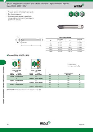 Цельные твердосплавные концевые фрезы общего назначения • Черновая/чистовая обработка Серии 423036 423037 • NINA™ • Режущая кромка не проходит через центр. • Для обработки фасок. • В таблицах представлены стандартные позиции. Дополнительные типы и покрытия доступны по запросу. Tочность изготовления D1 допуск h10+/- D допуск h6+/- )3 0/-0,040 )3 0/-0,006 >3–6 0/-0,048 >3–6 0/-0,008 >6–10 0/-0,058 >6–10 0/-0,009 >10–18 0/-0,070 >10–18 0/-0,011 >18–30 0/-0,084 >18–30 0/-0,013 Серии 423036 423037 • NINA ⅷ лучший выбор ࠗ альтернативный выбор CплKа3в0KF3-D0FC-FDCF CплKа3в0KF3-D0FC-HDPCHP TiAlN AlTiN номер номер номер номер глубина резания заказа по каталогу заказа по каталогу D1 D Ap1 max L 2343508 423036-000060 — 6,0 6 1,00 38 — 2628498 423037-000060 6,0 6 1,00 83 2343510 423036-000080 — 8,0 8 1,50 43 — 2628499 423037-000080 8,0 8 1,50 104 2343512 423036-000100 — 10,0 10 2,00 50 — 2628500 423037-000100 10,0 10 2,00 125 ПРИМЕЧАНИЕ. Рекомендации по применению приведены на стр. P11. P8 widia.com Цельные твердосплавные концевые фрезы общего назначения