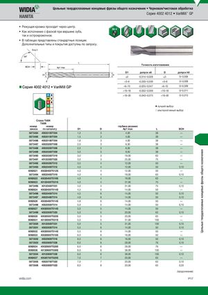 Цельные твердосплавные концевые фрезы общего назначения • Черновая/чистовая обработка Серия 4002 4012 • VariMill™ GP • Режущая кромка проходит через центр. • Как исполнение с фаской при вершине зуба, так и острокромочное. • В таблицах представлены стандартные позиции. Дополнительные типы и покрытия доступны по запросу. Вид X Tочность изготовления D1 допуск e8 D допуск h6 )3 -0,014/-0,028 )3 0/-0,006 >3–6 -0,020/-0,038 >3–6 0/-0,008 Серия 4002 4012 • VariMill GP >6–10 -0,025/-0,047 >6–10 0/-0,009 >10–18 -0,032/-0,059 >10–18 0/-0,011 >18–30 -0,040/-0,073 >18–30 0/-0,013 ⅷ лучший выбор ࠗ альтернативный выбор TiAlN Сплав TiAlN TiAlN номер номер глубина резания заказа по каталогу D1 D Ap1 max L BCH 5873484 40020100T004 1,0 3 4,00 38 — 5873485 40020150T004 1,5 3 4,00 38 — 5873486 40020180T004 1,8 3 4,00 38 — 5873487 40020200T006 2,0 3 6,30 38 — 5873488 40020250T006 2,5 3 6,30 38 — 5873489 40020300T009 3,0 3 9,50 38 — 5873490 40020300T019 3,0 3 19,00 63 — 5873491 40120300T025 3,0 3 25,00 75 — 5873492 40020350T012 3,5 4 12,00 50 — 5873493 40020400T012 4,0 4 12,00 50 0,10 6092621 40020400T012S 4,0 4 12,00 50 — 5873494 40020400T019 4,0 4 19,00 63 0,10 6092622 40020400T019S 4,0 4 19,00 63 — 6092623 40120400T031S 4,0 4 31,00 75 — 5873495 40120400T031 4,0 4 31,00 75 0,10 6092624 40020450T014S 4,5 6 14,00 50 — 5873496 40020450T014 4,5 6 14,00 50 0,10 5873497 40020480T014 4,8 6 14,00 50 0,10 6092626 40020480T014S 4,8 6 14,00 50 — 5873498 40020500T014 5,0 5 14,00 50 0,10 6092627 40020500T014S 5,0 5 14,00 50 — 5873499 40020500T020 5,0 5 20,00 63 0,10 6092628 40020500T020S 5,0 5 20,00 63 — 6092631 40120500T031S 5,0 5 31,00 100 — 5873500 40120500T031 5,0 5 31,00 100 0,10 5873501 40020550T014 5,5 6 14,00 50 0,10 6092632 40020550T014S 5,5 6 14,00 50 — 6092633 40020600T016S 6,0 6 16,00 50 — 5873502 40020600T016 6,0 6 16,00 50 0,10 5873503 40020600T028 6,0 6 28,00 76 0,10 6092634 40020600T028S 6,0 6 28,00 76 — 6092636 40120600T038S 6,0 6 38,00 100 — 5873504 40120600T038 6,0 6 38,00 100 0,10 6092637 40020700T020S 7,0 7 20,00 63 — 5873505 40020700T020 7,0 7 20,00 63 0,10 5873506 40020800T020 8,0 8 20,00 63 0,20 (продолжение) widia.com P17 Цельные твердосплавные концевые фрезы общего назначения