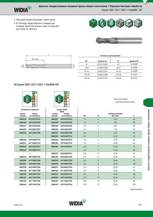 Цельные твердосплавные концевые фрезы общего назначения • Черновая/чистовая обработка Серия 4001 4011 4021 • VariMill™ GP • Режущая кромка проходит через центр. • В таблицах представлены стандартные позиции. Дополнительные типы и покрытия доступны по запросу. Tочность изготовления D1 допуск e8 D допуск h6 )3 -0,014/-0,028 )3 0/-0,006 >3–6 -0,020/-0,038 >3–6 0/-0,008 >6–10 -0,025/-0,047 >6–10 0/-0,009 >10–18 -0,032/-0,059 >10–18 0/-0,011 >18–30 -0,040/-0,073 >18–30 0/-0,013 Серия 4001 4011 4021 • VariMill GP ⅷ лучший выбор ࠗ альтернативный выбор СБпЕлЗавПбОеКзРпЫоТкИрыЯт-и..я СплTаiвAlTNiAlN TiAlN номер номер номер номер глубина резания заказа по каталогу заказа по каталогу D1 D Ap1 max L 5880425 40010100T004 5880387 40010100T004 1,0 3 4,00 38 5880426 40010150T005 5880388 40010150T005 1,5 3 5,00 38 5880427 40010200T006 5880389 40010200T006 2,0 3 6,30 38 5880428 40010250T007 5880390 40010250T007 2,5 3 7,00 38 5880429 40010300T009 5880391 40010300T009 3,0 3 9,50 38 — 5880392 40010350T012 3,5 4 12,00 50 5880430 40010400T012 5880393 40010400T012 4,0 4 12,00 50 5880431 40110400T019 5880395 40110400T019 4,0 4 19,00 63 5880432 40210400T031 5880396 40210400T031 4,0 4 31,00 75 5880433 40010500T014 — 5,0 5 14,00 50 — 5880397 40210500T014 5,0 6 14,00 50 5880435 40010600T020 5880398 40010600T020 6,0 6 20,00 63 5880436 40110600T028 5880399 40110600T028 6,0 6 28,00 76 5880437 40210600T038 5880400 40210600T038 6,0 6 38,00 100 5880438 40010800T020 5880401 40010800T020 8,0 8 20,00 63 5880439 40110800T028 5880402 40110800T028 8,0 8 28,00 76 5880440 40210800T040 5880403 40210800T040 8,0 8 40,00 100 5880441 40011000T022 5880404 40011000T022 10,0 10 22,00 76 5880442 40111000T032 5880405 40111000T032 10,0 10 32,00 89 5880443 40211000T045 5880406 40211000T045 10,0 10 45,00 100 (продолжение) widia.com P21 Цельные твердосплавные концевые фрезы общего назначения