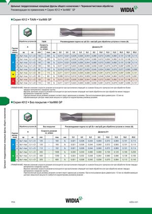 Цельные твердосплавные концевые фрезы общего назначения • Черновая/чистовая обработка Рекомендации по применению • Серия 4012 • VariMill™ GP Серия 4012 • TiAlN • VariMill GP Обработка уступов (A) TiAlN Рекомендуемая подача на зуб (fz = мм/зуб) для обработки уступов и стенок (A). Скорость Группа Aмате- резанияvc, м/мин Диаметр D1 риала ap ae min max мм 2,0 3,0 4,0 5,0 6,0 8,0 10,0 12,0 14,0 16,0 18,0 20,0 0 Ap1 max 0,1 x D 150 – 200 fz 0,014 0,021 0,028 0,036 0,044 0,060 0,072 0,083 0,092 0,101 0,108 0,114 1 Ap1 max 0,1 x D 150 – 200 fz 0,014 0,021 0,028 0,036 0,044 0,060 0,072 0,083 0,092 0,101 0,108 0,114 P 2 Ap1 max 0,1 x D 140 – 190 fz 0,014 0,021 0,028 0,036 0,044 0,060 0,072 0,083 0,092 0,101 0,108 0,114 3 Ap1 max 0,1 x D 120 – 160 fz 0,011 0,017 0,023 0,030 0,036 0,050 0,061 0,070 0,079 0,087 0,095 0,101 4 Ap1 max 0,1 x D 90 – 150 fz 0,010 0,016 0,021 0,027 0,033 0,045 0,054 0,062 0,070 0,077 0,083 0,088 1 Ap1 max 0,1 x D 90 – 115 fz 0,011 0,017 0,023 0,030 0,036 0,050 0,061 0,070 0,079 0,087 0,095 0,101 M 2 Ap1 max 0,1 x D 60 – 80 fz 0,009 0,014 0,019 0,024 0,029 0,040 0,048 0,056 0,063 0,070 0,076 0,081 1 Ap1 max 0,1 x D 120 – 150 fz 0,014 0,021 0,028 0,036 0,044 0,060 0,072 0,083 0,092 0,101 0,108 0,114 K 2 Ap1 max 0,1 x D 110 – 140 fz 0,011 0,017 0,023 0,030 0,036 0,050 0,061 0,070 0,079 0,087 0,095 0,101 ПРИМЕЧАНИЕ. Нижнее значение скорости резания используется при выполнении операций со съемом большого припуска или при обработке более твердых материалов в пределах группы. Верхнее значение скорости резания используется при выполнении операций чистовой обработки или при обработке менее твердых материалов в пределах группы. Перечисленные выше режимы резания соответствуют идеальным условиям. При использовании фрез диаметром >12 мм на обрабатывающих центрах невысокой мощности требуется корректировка режимов резания. Серия 4012 • Без покрытия • VariMill GP Обработка уступов (A) Без покрытия Рекомендуемая подача на зуб (fz = мм/зуб) для обработки уступов и стенок (A). Группа A Скорость резанияvc, м/мин Диаметр D1 матер- иала ap ae min max мм 3,0 4,0 6,0 8,0 10,0 12,0 16,0 20,0 0 Ap1 max 0,1 x D 120 – 160 fz 0,021 0,028 0,044 0,060 0,072 0,083 0,101 0,114 P 1 Ap1 max 0,1 x D 120 – 160 fz 0,021 0,028 0,044 0,060 0,072 0,083 0,101 0,114 2 Ap1 max 0,1 x D 112 – 152 fz 0,021 0,028 0,044 0,060 0,072 0,083 0,101 0,114 1 Ap1 max 0,1 x D 400 – 1600 fz 0,030 0,040 0,060 0,080 0,100 0,120 0,160 0,200 N 2 Ap1 max 0,1 x D 400 – 1200 fz 0,024 0,032 0,048 0,064 0,080 0,096 0,128 0,160 4 Ap1 max 0,1 x D 320 – 600 fz 0,021 0,028 0,042 0,056 0,070 0,084 0,112 0,140 ПРИМЕЧАНИЕ. Нижнее значение скорости резания используется при выполнении операций со съемом большого припуска или при обработке более твердых материалов в пределах группы. Верхнее значение скорости резания используется при выполнении операций чистовой обработки или при обработке менее твердых материалов в пределах группы. Перечисленные выше режимы резания соответствуют идеальным условиям. При использовании фрез диаметром >12 мм на обрабатывающих центрах невысокой мощности требуется корректировка режимов резания. P24 widia.com Цельные твердосплавные концевые фрезы общего назначения