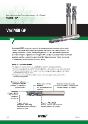 Концевые фрезы общего назначения с 4 зубьями • VariMill™ GP VariMill GP Фрезы VariMill GP позволяют выполнять плунжерное фрезерование, прорезание пазов и контурную обработку при обработке широкого спектра материалов. Эта серия разработана с целью увеличения удельного съема металла и обеспечения высокого качества обработанной поверхности. Стандартный ассортимент включает широкий диапазон диаметров, длин и конфигураций вершины (таких как фаска, острая кромка и сферическая режущая часть). VariMill GP • Фреза с 4 зубьями • Инструменты общего назначения для обработки широкого спектра материалов. • Выполнение операций черновой и чистовой обработки с использованием одного инструмента. • В наличии имеются исполнения с различными конфигурациями вершины, различной общей длиной и длиной режущей части. • Инструмент с четырьмя зубьями обеспечивает повышение удельного съема металла и стойкости инструмента. Затылование зубьев по Архимедовой спирали Угол наклона винтовой Высококачественная основа Прочность и стабильность линии 30° Большой удельный съем металла и режущей кромки. Для черновой и чистовой высокая стойкость инструмента. обработки. Упрочнение режущей кромки Для увеличения надёжности и стойкости. Режущая кромка, Покрытие PVD из TIALN проходящая через центр Большой удельный съем металла и Для плунжерного фрезерования и высокая стойкость инструмента. врезания под углом. P38 widia.com