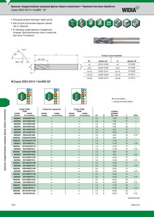 Цельные твердосплавные концевые фрезы общего назначения • Черновая/чистовая обработка Серии D004 D014 • VariMill™ GP • Режущая кромка проходит через центр. • Как острое исполнение вершин зубьев, так и с фаской. • В таблицах представлены стандартные позиции. Дополнительные типы и покрытия доступны по запросу. Вид X Tочность изготовления D1 допуск e8 D допуск h6 )3 -0,014/-0,028 )3 0/-0,006 >3–6 -0,020/-0,038 >3–6 0/-0,008 >6–10 -0,025/-0,047 >6–10 0/-0,009 >10–18 -0,032/-0,059 >10–18 0/-0,011 >18–30 -0,040/-0,073 >18–30 0/-0,013 Серии D004 D014 • VariMill GP ⅷ лучший выбор ࠗ альтернативный выбор TiAlN БЕЗ ПОКРЫТИЯ- .. TiAlN Сплав TiAlN Сплав без покрытия Сплав TiAlN TiAlN TiAlN глубина номер номер номер номер номер номер резания заказа по каталогу заказа по каталогу заказа по каталогу D1 D Ap1 max L BCH 5825894 D0040200T004 — — 2,0 6 4,00 50 — 5825895 D0140200T007 — — 2,0 6 7,00 57 — 5825896 D0140250T008 — — 2,5 6 8,00 57 — 5825897 D0040300T005 — — 3,0 6 5,00 50 — 5825898 D0140300T008 — — 3,0 6 8,00 57 — 5825899 D0140350T010 — — 3,5 6 10,00 57 — 5825900 D0040400T008 — — 4,0 6 8,00 54 0,10 6085348 D0040400T008S — — 4,0 6 8,00 54 — 6085349 D0140400T011S — — 4,0 6 11,00 57 — 5825931 D0140400T011 — — 4,0 6 11,00 57 0,10 6085350 D0140450T011S — — 4,5 6 11,00 57 — 5825932 D0140450T011 — — 4,5 6 11,00 57 0,10 6085361 D0040500T009S — — 5,0 6 9,00 54 — 5825933 D0040500T009 — — 5,0 6 9,00 54 0,10 6085362 D0140500T013S — — 5,0 6 13,00 57 — 5825934 D0140500T013 — — 5,0 6 13,00 57 0,10 6085363 D0140550T013S — — 5,5 6 13,00 57 — 5825935 D0140550T013 — — 5,5 6 13,00 57 0,10 6085364 D0040600T010S — — 6,0 6 10,00 54 — 5825936 D0040600T010 — — 6,0 6 10,00 54 0,10 6085365 D0140600T013S — — 6,0 6 13,00 57 — 5825937 D0140600T013 — — 6,0 6 13,00 57 0,10 6085366 D0140650T016S — — 6,5 8 16,00 63 — 5825938 D0140650T016 — — 6,5 8 16,00 63 0,10 6085367 D0040700T011S — — 7,0 8 11,00 58 — 5825939 D0040700T011 — — 7,0 8 11,00 58 0,10 6085368 D0140700T016S — — 7,0 8 16,00 63 — 5825940 D0140700T016 — — 7,0 8 16,00 63 0,10 (продолжение) P40 widia.com Цельные твердосплавные концевые фрезы общего назначения