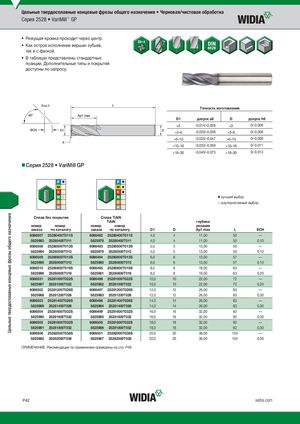 Цельные твердосплавные концевые фрезы общего назначения • Черновая/чистовая обработка Серия 2528 • VariMill™ GP • Режущая кромка проходит через центр. • Как острое исполнение вершин зубьев, так и с фаской. • В таблицах представлены стандартные позиции. Дополнительные типы и покрытия доступны по запросу. Вид X Tочность изготовления D1 допуск e8 D допуск h6 )3 -0,014/-0,028 )3 0/-0,006 >3–6 -0,020/-0,038 >3–6 0/-0,008 >6–10 -0,025/-0,047 >6–10 0/-0,009 >10–18 -0,032/-0,059 >10–18 0/-0,011 >18–30 -0,040/-0,073 >18–30 0/-0,013 Серия 2528 • VariMill GP ⅷ лучший выбор ࠗ альтернативный выбор СБпЕлЗавПбОеКзРпЫоТкИрыЯт-и..я СплTаiвAlTNiAlN TiAlN глубина номер номер номер номер резания заказа по каталогу заказа по каталогу D1 D Ap1 max L BCH 6086507 25280400T011S 6086492 25280400T011S 4,0 4 11,00 50 — 5825993 25280400T011 5825978 25280400T011 4,0 4 11,00 50 0,10 6086508 25280500T013S 6086493 25280500T013S 5,0 5 13,00 50 — 5825994 25280500T013 5825979 25280500T013 5,0 5 13,00 50 0,10 6086509 25280600T013S 6086494 25280600T013S 6,0 6 13,00 57 — 5825995 25280600T013 5825980 25280600T013 6,0 6 13,00 57 0,10 6086510 25280800T019S 6086495 25280800T019S 8,0 8 19,00 63 — 5825996 25280800T019 5825981 25280800T019 8,0 8 19,00 63 0,20 6086531 25281000T022S 6086496 25281000T022S 10,0 10 22,00 72 — 5825997 25281000T022 5825982 25281000T022 10,0 10 22,00 72 0,20 6086502 25281200T026S 6086497 25281200T026S 12,0 12 26,00 83 — 5825988 25281200T026 5825983 25281200T026 12,0 12 26,00 83 0,30 6086503 25281400T026S 6086498 25281400T026S 14,0 14 26,00 83 — 5825989 25281400T026 5825984 25281400T026 14,0 14 26,00 83 0,30 6086504 25281600T032S 6086499 25281600T032S 16,0 16 32,00 92 — 5825990 25281600T032 5825985 25281600T032 16,0 16 32,00 92 0,30 6086505 25281800T032S 6086500 25281800T032S 18,0 18 32,00 92 — 5825991 25281800T032 5825986 25281800T032 18,0 18 32,00 92 0,30 6086506 25282000T038S 6086501 25282000T038S 20,0 20 38,00 104 — 5825992 25282000T038 5825987 25282000T038 20,0 20 38,00 104 0,30 ПРИМЕЧАНИЕ. Рекомендации по применению приведены на стр. P49. P42 widia.com Цельные твердосплавные концевые фрезы общего назначения