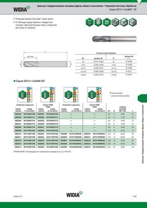 Цельные твердосплавные концевые фрезы общего назначения • Черновая/чистовая обработка Серия D010 • VariMill™ GP • Режущая кромка проходит через центр. • В таблицах представлены стандартные позиции. Дополнительные типы и покрытия доступны по запросу. Tочность изготовления допуск h6 D1 допуск e8 D +/- )3 -0,014/-0,028 )3 0/-0,006 >3–6 -0,020/-0,038 >3–6 0/-0,008 >6–10 -0,025/-0,047 >6–10 0/-0,009 >10–18 -0,032/-0,059 >10–18 0/-0,011 >18–30 -0,040/-0,073 >18–30 0/-0,013 Серия D010 • VariMill GP ⅷ лучший выбор ࠗ альтернативный выбор СБпЕлЗавПбОеКзРпЫоТкИрыЯт-и..я СплTаiвAlTNiAlN СБпЕлЗавПбОеКзРпЫоТкИрыЯт-и..я СплTаiвAlTNiAlN TiAlN TiAlN глубина номер номер номер номер номер номер номер номер резания заказа по каталогу заказа по каталогу заказа по каталогу заказа по каталогу D1 D Ap1 max L 5825604 D0100300T008 5825527 D0100300T008 — — 3,0 6 8,00 57 5825605 D0100400T011 5825528 D0100400T011 — — 4,0 6 11,00 57 5825606 D0100500T013 5825529 D0100500T013 — — 5,0 6 13,00 57 5825607 D0100600T013 5825530 D0100600T013 — — 6,0 6 13,00 57 5825608 D0100800T019 5825531 D0100800T019 — — 8,0 8 19,00 63 5825609 D0101000T022 5825532 D0101000T022 — — 10,0 10 22,00 72 5825610 D0101200T026 5825533 D0101200T026 5825589 D0101200W026 5825540 D0101200W026 12,0 12 26,00 83 5825611 D0101400T026 5825534 D0101400T026 5825590 D0101400W026 5825541 D0101400W026 14,0 14 26,00 83 5825612 D0101600T032 5825536 D0101600T032 5825591 D0101600W032 5825542 D0101600W032 16,0 16 32,00 92 5825613 D0101800T032 5825538 D0101800T032 5825592 D0101800W032 5825543 D0101800W032 18,0 18 32,00 92 5825614 D0102000T038 5825539 D0102000T038 5825593 D0102000W038 5825544 D0102000W038 20,0 20 38,00 104 ПРИМЕЧАНИЕ. Рекомендации по применению приведены на стр. P50–P51. widia.com P45 Цельные твердосплавные концевые фрезы общего назначения