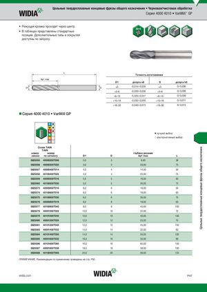 Цельные твердосплавные концевые фрезы общего назначения • Черновая/чистовая обработка Серия 4000 4010 • VariMill™ GP • Режущая кромка проходит через центр. • В таблицах представлены стандартные позиции. Дополнительные типы и покрытия доступны по запросу. Tочность изготовления D1 допуск e8 D допуск h6 )3 -0,014/-0,028 )3 0/-0,006 >3–6 -0,020/-0,038 >3–6 0/-0,008 >6–10 -0,025/-0,047 >6–10 0/-0,009 >10–18 -0,032/-0,059 >10–18 0/-0,011 >18–30 -0,040/-0,073 >18–30 0/-0,013 Серия 4000 4010 • VariMill GP ⅷ лучший выбор ࠗ альтернативный выбор СплTаiвAlTNiAlN TiAlN номер номер глубина резания заказа по каталогу D1 D Ap1 max L 5825555 40000200T006 2,0 3 6,30 38 5825556 40000300T020 3,0 3 20,00 75 5825557 40000400T014 4,0 4 14,00 50 5825558 40100400T025 4,0 4 25,00 75 5825559 40000500T016 5,0 5 16,00 50 5825560 40100500T030 5,0 5 30,00 75 5825573 40000600T016 6,0 6 16,00 50 5825574 40100600T019 6,0 6 19,00 63 5825575 40100600T030 6,0 6 30,00 75 5825576 40000800T019 8,0 8 19,00 63 5825577 40100800T040 8,0 8 40,00 100 5825578 40001000T022 10,0 10 22,00 72 5825579 40101000T040 10,0 10 40,00 100 5825580 40001200T025 12,0 12 25,00 75 5825581 40101200T045 12,0 12 45,00 150 5825583 40001400T032 14,0 14 32,00 83 5825584 40101400T050 14,0 14 50,00 100 5825585 40001600T032 16,0 16 32,00 89 5825586 40101600T065 16,0 16 65,00 150 5825587 40001800T038 18,0 18 38,00 100 5825588 40102000T056 20,0 20 56,00 125 ПРИМЕЧАНИЕ. Рекомендации по применению приведены на стр. P50. widia.com P47 Цельные твердосплавные концевые фрезы общего назначения