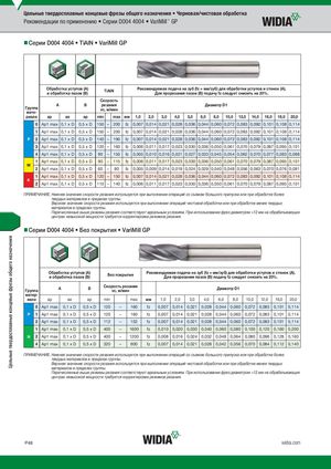 Цельные твердосплавные концевые фрезы общего назначения • Черновая/чистовая обработка Рекомендации по применению • Серии D004 4004 • VariMill™ GP Серии D004 4004 • TiAlN • VariMill GP Обработка уступов (A)и обработка пазов (B)TiAlN Рекомендуемая подача на зуб (fz = мм/зуб) для обработки уступов и стенок (A).Для прорезания пазов (B) подачу fz следует снизить на 20%. Скорость Группа A B резанияvc, м/мин Диаметр D1 мате- риала ap ae ap min max мм 1,0 2,0 3,0 4,0 5,0 6,0 8,0 10,0 12,0 14,0 16,0 18,0 20,0 0 Ap1 max 0,1 x D 0,5 x D 150 – 200 fz 0,007 0,014 0,021 0,028 0,036 0,044 0,060 0,072 0,083 0,092 0,101 0,108 0,114 1 Ap1 max 0,1 x D 0,5 x D 150 – 200 fz 0,007 0,014 0,021 0,028 0,036 0,044 0,060 0,072 0,083 0,092 0,101 0,108 0,114 P 2 Ap1 max 0,1 x D 0,5 x D 140 – 190 fz 0,007 0,014 0,021 0,028 0,036 0,044 0,060 0,072 0,083 0,092 0,101 0,108 0,114 3 Ap1 max 0,1 x D 0,5 x D 120 – 160 fz 0,006 0,011 0,017 0,023 0,030 0,036 0,050 0,061 0,070 0,079 0,087 0,095 0,101 4 Ap1 max 0,1 x D 0,5 x D 90 – 150 fz 0,005 0,010 0,016 0,021 0,027 0,033 0,045 0,054 0,062 0,070 0,077 0,083 0,088 1 Ap1 max 0,1 x D 0,5 x D 90 – 115 fz 0,006 0,011 0,017 0,023 0,030 0,036 0,050 0,061 0,070 0,079 0,087 0,095 0,101 M 2 Ap1 max 0,1 x D 0,5 x D 60 – 80 fz 0,005 0,009 0,014 0,019 0,024 0,029 0,040 0,048 0,056 0,063 0,070 0,076 0,081 1 Ap1 max 0,1 x D 0,5 x D 120 – 150 fz 0,007 0,014 0,021 0,028 0,036 0,044 0,060 0,072 0,083 0,092 0,101 0,108 0,114 K 2 Ap1 max 0,1 x D 0,5 x D 110 – 140 fz 0,006 0,011 0,017 0,023 0,030 0,036 0,050 0,061 0,070 0,079 0,087 0,095 0,101 ПРИМЕЧАНИЕ. Нижнее значение скорости резания используется при выполнении операций со съемом большого припуска или при обработке более твердых материалов в пределах группы. Верхнее значение скорости резания используется при выполнении операций чистовой обработки или при обработке менее твердых материалов в пределах группы. Перечисленные выше режимы резания соответствуют идеальным условиям. При использовании фрез диаметром >12 мм на обрабатывающих центрах невысокой мощности требуется корректировка режимов резания. Серии D004 4004 • Без покрытия • VariMill GP Обработка уступов (A)и обработка пазов (B)Без покрытияРекомендуемая подача на зуб (fz = мм/зуб) для обработки уступов и стенок (A).Для прорезания пазов (B) подачу fz следует снизить на 20%. Группа A B Скорость резанияvc, м/мин Диаметр D1 матер- иала ap ae ap min max мм 1,0 2,0 3,0 4,0 6,0 8,0 10,0 12,0 16,0 20,0 0 Ap1 max 0,1 x D 0,5 x D 120 – 160 fz 0,007 0,014 0,021 0,028 0,044 0,060 0,072 0,083 0,101 0,114 P 1 Ap1 max 0,1 x D 0,5 x D 120 – 160 fz 0,007 0,014 0,021 0,028 0,044 0,060 0,072 0,083 0,101 0,114 2 Ap1 max 0,1 x D 0,5 x D 112 – 152 fz 0,007 0,014 0,021 0,028 0,044 0,060 0,072 0,083 0,101 0,114 1 Ap1 max 0,1 x D 0,5 x D 400 – 1600 fz 0,010 0,020 0,030 0,040 0,060 0,080 0,100 0,120 0,160 0,200 N 2 Ap1 max 0,1 x D 0,5 x D 400 – 1200 fz 0,008 0,016 0,024 0,032 0,048 0,064 0,080 0,096 0,128 0,160 4 Ap1 max 0,1 x D 0,5 x D 320 – 600 fz 0,007 0,014 0,021 0,028 0,042 0,056 0,070 0,084 0,112 0,140 ПРИМЕЧАНИЕ. Нижнее значение скорости резания используется при выполнении операций со съемом большого припуска или при обработке более твердых материалов в пределах группы. Верхнее значение скорости резания используется при выполнении операций чистовой обработки или при обработке менее твердых материалов в пределах группы. Перечисленные выше режимы резания соответствуют идеальным условиям. При использовании фрез диаметром >12 мм на обрабатывающих центрах невысокой мощности требуется корректировка режимов резания. P48 widia.com Цельные твердосплавные концевые фрезы общего назначения
