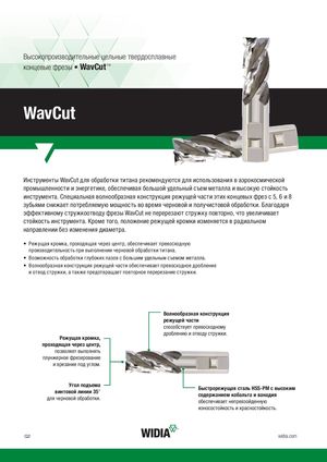 Высокопроизводительные цельные твердосплавные концевые фрезы • WavCut™ WavCut Инструменты WavCut для обработки титана рекомендуются для использования в аэрокосмической промышленности и энергетике, обеспечивая большой удельный съем металла и высокую стойкость инструмента. Специальная волнообразная конструкция режущей части этих концевых фрез с 5, 6 и 8 зубьями снижает потребляемую мощность во время черновой и получистовой обработки. Благодаря эффективному стружкоотводу фрезы WavCut не перерезают стружку повторно, что увеличивает стойкость инструмента. Кроме того, положение режущей кромки изменяется в радиальном направлении без изменения диаметра. • Режущая кромка, проходящая через центр, обеспечивает превосходную производительность при выполнении черновой обработки титана. • Возможность обработки глубоких пазов с большим удельным съемом металла. • Волнообразная конструкция режущей части обеспечивает превосходное дробление и отвод стружки, а также предотвращает повторное перерезание стружки. Волнообразная конструкция режущей части способствует превосходному дроблению и отводу стружки. Режущая кромка, проходящая через центр, позволяет выполнять плунжерное фрезерование и врезание под углом. Угол подъемавинтовой линии 35°для черновой обработки. Быстрорежущая сталь HSS-PM с высокимсодержанием кобальта и ванадияобеспечивает непревзойденную износостойкость и красностойкость. Q2 widia.com