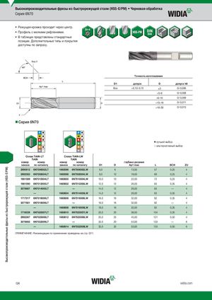 Высокопроизводительные фрезы из быстрорежущей стали (HSS-E/PM) • Черновая обработка Серия 6N70 • Режущая кромка проходит через центр. • Профиль с мелкими рифлениями. • В таблицах представлены стандартные позиции. Дополнительные типы и покрытия доступны по запросу. Вид Х Tочность изготовления D1 допуск D допуск h6 Все +0,12/-0,12 )3 0/-0,006 >3–6 0/-0,008 >6–10 0/-0,009 >10–18 0/-0,011 >18–30 0/-0,013 X Серия 6N70 ⅷ лучший выбор ࠗ альтернативный выбор СплTаiAв lNTi-ALlWN-LT СплTаiвATlNiA-LlNT-LW TiAlN TiAlN номер номер номер номер глубина резания заказа по каталогу заказа по каталогу D1 D Ap1 max L BCH ZU 2990812 6N7006002LT 1660596 6N7006002LW 6,0 6 13,00 57 0,25 4 2992083 6N7008004LT 1660598 6N7008004LW 8,0 10 19,00 69 0,25 4 1981089 6N7010004LT 1660600 6N7010004LW 10,0 10 22,00 72 0,25 4 1981090 6N7012005LT 1660602 6N7012005LW 12,0 12 26,00 83 0,35 4 3078687 6N7014005LT — 14,0 12 26,00 83 — 4 — 1660604 6N7014005LW 14,0 12 26,00 83 0,35 4 1717017 6N7016006LT 1660606 6N7016006LW 16,0 16 32,00 92 0,35 4 3077681 6N7018006LT — 18,0 16 32,00 92 — 4 — 1660608 6N7018006LW 18,0 16 32,00 92 0,35 4 1716039 6N7020007LT 1660610 6N7020007LW 20,0 20 38,00 104 0,35 4 2992087 6N7025008LT 1660612 6N7025008LW 25,0 25 45,00 121 0,50 4 3078692 6N7032009LT — 32,0 20 53,00 133 — 6 — 1660614 6N7032009LW 32,0 32 53,00 133 0,50 6 ПРИМЕЧАНИЕ. Рекомендации по применению приведены на стр. Q11. Q6 widia.com Высокопроизводительные фрезы из быстрорежущей стали (HSS-E/PM)