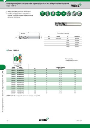 Высокопроизводительные фрезы из быстрорежущей стали (HSS-E/PM) • Чистовая обработка Серия 1N0M JJ • Режущая кромка проходит через центр. • В таблицах представлены стандартные позиции. Дополнительные типы и покрытия доступны по запросу. Tочность изготовления D1 допуск D допуск h6 Все +0,02/-0,0 )3 0/-0,006 >3–6 0/-0,008 >6–10 0/-0,009 >10–18 0/-0,011 >18–30 0/-0,013 Серия 1N0M JJ ⅷ лучший выбор ࠗ альтернативный выбор СплаTв iATilANlN-LJ TiAlN номер номер глубина резания заказа по каталогу D1 D Ap1 max L 2605576 1N0M03002LJ 3,0 6 10,00 50 2605577 1N0M04003LJ 4,0 8 12,00 60 2605578 1N0M05003LJ 5,0 8 15,00 60 2605579 1N0M06003LJ 6,0 8 15,00 60 2605580 1N0M08004LJ 8,0 10 20,00 65 2605581 1N0M10004LJ 10,0 10 25,00 75 2605582 1N0M12005LJ 12,0 12 30,00 80 2605583 1N0M14006LJ 14,0 16 35,00 90 2605584 1N0M16006LJ 16,0 16 40,00 95 2605585 1N0M18007LJ 18,0 20 40,00 105 2605586 1N0M20007LJ 20,0 20 45,00 110 2605587 1N0M22007LJ 22,0 20 45,00 125 ПРИМЕЧАНИЕ. Рекомендации по применению приведены на стр. Q12. Q8 widia.com Высокопроизводительные фрезы из быстрорежущей стали (HSS-E/PM)