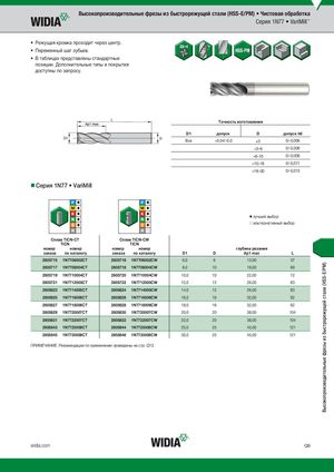 Высокопроизводительные фрезы из быстрорежущей стали (HSS-E/PM) • Чистовая обработка Серия 1N77 • VariMill™ • Режущая кромка проходит через центр. • Переменный шаг зубьев. • В таблицах представлены стандартные позиции. Дополнительные типы и покрытия доступны по запросу. Tочность изготовления D1 допуск D допуск h6 Все +0,04/-0,0 )3 0/-0,006 >3–6 0/-0,008 >6–10 0/-0,009 >10–18 0/-0,011 >18–30 0/-0,013 Серия 1N77 • VariMill ⅷ лучший выбор ࠗ альтернативный выбор СплTаiвCNTi-CCNT-CT СплTаIвCTNi-CCNW-CW TiCN TiCN номер номер номер номер глубина резания заказа по каталогу заказа по каталогу D1 D Ap1 max L 2605715 1N7706002CT 2605716 1N7706002CW 6,0 6 13,00 57 2605717 1N7708004CT 2605718 1N7708004CW 8,0 10 19,00 69 2605719 1N7710004CT 2605720 1N7710004CW 10,0 10 22,00 72 2605721 1N7712005CT 2605722 1N7712005CW 12,0 12 26,00 83 2605823 1N7714005CT 2605824 1N7714005CW 14,0 12 26,00 83 2605825 1N7716006CT 2605826 1N7716006CW 16,0 16 32,00 92 2605827 1N7718006CT 2605828 1N7718006CW 18,0 16 32,00 92 2605829 1N7720007CT 2605830 1N7720007CW 20,0 20 38,00 104 2605831 1N7722007CT 2605832 1N7722007CW 22,0 20 38,00 104 2605843 1N7725008CT 2605844 1N7725008CW 25,0 25 45,00 121 2605845 1N7730008CT 2605846 1N7730008CW 30,0 25 45,00 121 ПРИМЕЧАНИЕ. Рекомендации по применению приведены на стр. Q13. widia.com Q9 Высокопроизводительные фрезы из быстрорежущей стали (HSS-E/PM)
