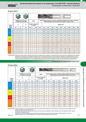 Высокопроизводительные фрезы из быстрорежущей стали (HSS-E/PM) • Черновая обработка Рекомендации по применению • Серия 6N70 Серия 6N70 Обработка уступов (A)и обработка пазов (B)TiAlN Рекомендуемая подача на зуб (fz = мм/зуб) для обработки уступов и стенок (A).Для прорезания пазов (B) подачу fz следует снизить на 20%. Группа A B Скорость резанияvc, м/мин Диаметр D1 мате- риала ap ae ap min max мм 6,0 8,0 10,0 12,0 16,0 18,0 20,0 25,0 32,0 1 1,5 x D 0,5 x D 1xD 70 – 80 fz 0,058 0,078 0,090 0,099 0,121 0,130 0,137 0,149 0,190 2 1,5 x D 0,5 x D 1xD 60 – 80 fz 0,058 0,078 0,090 0,099 0,121 0,130 0,137 0,149 0,190 P 3 1,5 x D 0,5 x D 1xD 50 – 70 fz 0,048 0,065 0,076 0,084 0,105 0,113 0,121 0,137 0,175 5 1,5 x D 0,5 x D 1xD 25 – 35 fz 0,039 0,052 0,061 0,067 0,084 0,091 0,097 0,109 0,140 1 1,5 x D 0,5 x D 1xD 25 – 35 fz 0,048 0,065 0,076 0,084 0,105 0,113 0,121 0,137 0,175 M 2 1,5 x D 0,5 x D 1xD 25 – 30 fz 0,039 0,052 0,061 0,067 0,084 0,091 0,097 0,109 0,140 3 1,5 x D 0,5 x D 1xD 15 – 20 fz 0,033 0,044 0,051 0,056 0,068 0,073 0,078 0,085 0,109 1 1,5 x D 0,5 x D 1xD 70 – 80 fz 0,058 0,078 0,090 0,099 0,121 0,130 0,137 0,149 0,190 K 2 1,5 x D 0,5 x D 1xD 50 – 70 fz 0,048 0,065 0,076 0,084 0,105 0,113 0,121 0,137 0,175 1 1,5 x D 0,5 x D 1xD 15 – 30 fz 0,048 0,065 0,076 0,084 0,105 0,113 0,121 0,137 0,175 2 1,5 x D 0,5 x D 1xD 5 – 15 fz 0,026 0,034 0,040 0,045 0,056 0,060 0,065 0,074 0,094 S 3 1,5 x D 0,5 x D 1xD 15 – 30 fz 0,039 0,052 0,061 0,067 0,084 0,091 0,097 0,109 0,140 4 1,5 x D 0,5 x D 1xD 15 – 30 fz 0,034 0,048 0,056 0,062 0,077 0,083 0,089 0,100 0,128 ПРИМЕЧАНИЕ. Нижнее значение скорости резания используется при выполнении операций со съемом большого припуска или при обработке более твердых материалов в пределах группы. Верхнее значение скорости резания используется при выполнении операций чистовой обработки или при обработке менее твердых материалов в пределах группы. Перечисленные выше режимы резания соответствуют идеальным условиям. При использовании фрез диаметром >12 мм на обрабатывающих центрах невысокой мощности требуется корректировка режимов резания. Рекомендации по применению • Серия 6NL6 Серия 6NL6 Обработка уступов (A)и обработка пазов (B)TiAlN Рекомендуемая подача на зуб (fz = мм/зуб) для обработки уступов и стенок (A).Для прорезания пазов (B) подачу fz следует снизить на 20%. Группа A B Скорость резанияvc, м/мин Диаметр D1 мате- риала ap ae ap min max мм 10,0 12,0 16,0 20,0 25,0 1 1,5 x D 0,5 x D 1xD 70 – 80 fz 0,063 0,070 0,085 0,096 0,104 2 1,5 x D 0,5 x D 1xD 60 – 80 fz 0,063 0,070 0,085 0,096 0,104 P 3 1,5 x D 0,5 x D 1xD 50 – 70 fz 0,053 0,059 0,073 0,085 0,096 5 1,5 x D 0,5 x D 1xD 25 – 35 fz 0,042 0,047 0,059 0,068 0,076 1 1,5 x D 0,5 x D 1xD 25 – 35 fz 0,053 0,059 0,073 0,085 0,096 M 2 1,5 x D 0,5 x D 1xD 25 – 30 fz 0,042 0,047 0,059 0,068 0,076 3 1,5 x D 0,5 x D 1xD 15 – 20 fz 0,035 0,039 0,048 0,054 0,060 1 1,5 x D 0,5 x D 1xD 70 – 80 fz 0,063 0,070 0,085 0,096 0,104 K 2 1,5 x D 0,5 x D 1xD 50 – 70 fz 0,053 0,059 0,073 0,085 0,096 1 1,5 x D 0,5 x D 1xD 15 – 30 fz 0,053 0,059 0,073 0,085 0,096 2 1,5 x D 0,5 x D 1xD 5 – 15 fz 0,028 0,031 0,039 0,045 0,051 S 3 1,5 x D 0,5 x D 1xD 15 – 30 fz 0,042 0,047 0,059 0,068 0,076 4 1,5 x D 0,5 x D 1xD 10 – 20 fz 0,039 0,043 0,054 0,062 0,070 ПРИМЕЧАНИЕ. Нижнее значение скорости резания используется при выполнении операций со съемом большого припуска или при обработке более твердых материалов в пределах группы. Верхнее значение скорости резания используется при выполнении операций чистовой обработки или при обработке менее твердых материалов в пределах группы. Перечисленные выше режимы резания соответствуют идеальным условиям. При использовании фрез диаметром >12 мм на widia.com обрабатывающих центрах невысокой мощности требуется корректировка режимов резания. Q11 Высокопроизводительные фрезы из быстрорежущей стали (HSS-E/PM)