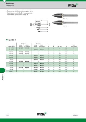 Борфрезы Серия SG-M • Заостренная параболическая режущая часть. • Хвостовики типов A, B и C — описание типов хвостовиков представлено на стр. R5. Single Cut Master Cut Серия SG-M Single Cut Master Cut номер номер номер номер тип Номер USCTI заказа по каталогу заказа по каталогу D1 D Ap1 max L хвостовика SG-41M-2 2991258 M40428 – 3,0 3,0 6,4 38,1 C SG-41M-2 – 1293463 M41428 3,0 3,0 6,4 38,1 A SG-43M 2730335 M40430 – 3,0 3,0 9,5 38,1 C SG-44M 3009465 M40431 – 3,0 3,0 12,7 38,1 C SG-44M – 1534016 M41431 3,0 3,0 12,7 38,1 A SG-53M – 2894601 M41432 4,8 3,0 12,7 38,1 A SG-1M – 2987329 M41433 6,0 6,0 15,9 50,8 C SG-51M 2991261 M40434 – 6,4 3,0 12,7 69,9 C SG-51M – 1293476 M41434 6,4 3,0 12,7 69,9 B SG-2M – 2987327 M41435 7,9 6,0 19,1 63,5 C SG-3M 2981799 M40436 2987326 M41436 9,5 6,0 19,1 63,5 C SG-5M – 2729591 M41439 12,7 6,0 25,4 69,9 C SG-5M-2 – 3324707 M41442 12,7 8,0 25,4 76,2 C R12 widia.com Борфрезы