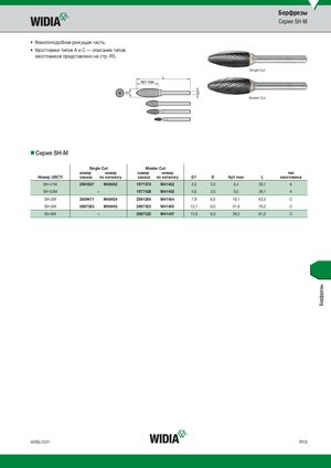 Борфрезы Серия SH-M • Факелоподобная режущая часть. • Хвостовики типов A и C — описание типов хвостовиков представлено на стр. R5. Single Cut Master Cut Серия SH-M Single Cut Master Cut номер номер номер номер тип Номер USCTI заказа по каталогу заказа по каталогу D1 D Ap1 max L хвостовика SH-41M 2991807 M40452 1977378 M41452 3,0 3,0 6,4 38,1 A SH-53M – 1977429 M41453 4,8 3,0 9,5 38,1 A SH-2M 3009471 M40454 2991284 M41454 7,9 6,0 19,1 63,5 C SH-5M 2987353 M40455 2987323 M41455 12,7 6,0 31,8 76,2 C SH-6M – 2987322 M41457 15,9 6,0 36,5 81,0 C widia.com R13 Борфрезы