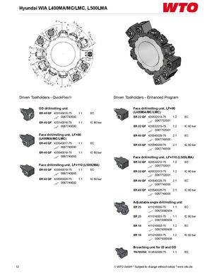 Hyundai WIA L400MA/MC/LMC, L500LMA Driven Toolholders - QuickFlex® Driven Toolholders - Enhanced Program OD drill/milling unit Face drill/milling unit, LF=90 ER-40 QF 420140015-75 1:1 EC (L400MA/MC/LMC) 0067740000 ER-32 QF 420532014-75 1:2 EC ER-40 QF 420140016-75 1:1 IC 80 bar 0067732001 0067740000 ER-32 QF 420532015-75 1:2 IC 80 bar 0067732001 Face drill/milling unit, LF=90 ER-40 QF 420540029-75 2:1 EC (L400MA/MC/LMC) 0067740000 ER-40 QF 420540017-75 1:1 EC ER-40 QF 420540030-75 2:1 IC 80 bar 0067740000 0067740000 ER-40 QF 420540018-75 1:1 IC 80 bar 0067740000 Face drill/milling unit, LF=110 (L500LMA) ER-32 QF 420532012-75 1:2 EC Face drill/milling unit, LF=110 (L500LMA) 0067732001 ER-40 QF 420540019-75 1:1 EC ER-32 QF 420532013-75 1:2 IC 80 bar 0067740000 0067732001 ER-40 QF 420540020-75 1:1 IC 80 bar ER-40 QF 420540025-75 2:1 EC 0067740000 0067740000 ER-40 QF 420540026-75 2:1 IC 80 bar 0067740000 Adjustable angle drill/milling unit ER 25 411016000-75 1:1 EC 00675000934 ER 25 411016001-75 1:1 IC 80 bar 00675000934 ER 16 411010002-75 1:2 EC 00675000936 ER 16 411010003-75 1:2 IC 80 bar 00675000936 Broaching unit for ID and OD TN765050 414532000-75 1:1 EC 12 © WTO GmbH * Subject to change without notice * www.wto.de