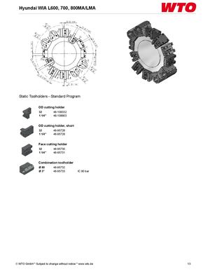 Hyundai WIA L600, 700, 800MA/LMA Static Toolholders - Standard Program OD cutting holder 32 48-108332 1 1/4" 48-108903 OD cutting holder, short 32 48-95726 1 1/4" 48-95728 Face cutting holder 32 48-95730 1 1/4" 48-95731 Combination toolholder Ø 80 48-95732 Ø 3" 48-95733 IC 80 bar © WTO GmbH * Subject to change without notice * www.wto.de 13