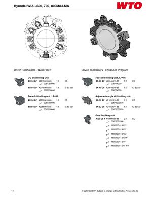Hyundai WIA L600, 700, 800MA/LMA Driven Toolholders - QuickFlex® Driven Toolholders - Enhanced Program OD drill/milling unit Face drill/milling unit, LF=85 ER-50 QF 420150015-85 1:1 EC ER-40 QF 420540015-85 1:2 EC 0067750000 0067740001 ER-50 QF 420150016-85 1:1 IC 80 bar ER-40 QF 420540016-85 1:2 IC 80 bar 0067750000 0067740001 Face drill/milling unit, LF=85 Adjustable angle drill/milling unit ER-50 QF 420550015-85 1:1 EC ER-32 QF 421032010-85 1:1 EC 0067750000 00675000976 ER-50 QF 420550016-85 1:1 IC 80 bar ER-32 QF 421032011-85 1:1 IC 80 bar 0067750000 00675000976 Gear hobbing unit Type C5-1 410900000-85 2:1 EC 00675001008 160022C51 Ø 22 160027C51 Ø 27 160032C51 Ø 32 160019C51 Ø 3/4" 160025C51 Ø 1" 160031C51 Ø 1 1/4" 14 © WTO GmbH * Subject to change without notice * www.wto.de