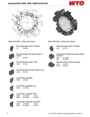 Hyundai WIA L2000, 2600, 3000Y/LY/SY/LSY Static Toolholders - Enhanced Program Static Toolholders - Enhanced Program OD cutting holder, double, 24 station Boring bar holder, double, 24 station 20 48-92089 Ø 25 48-92102 OD cutting holder, both sides, double, 24 Combination toolholder, both sides, double, station 24 station 20 48-92091 Ø 25 48-109092 Ø 1" 48-108887 OD cutting holder, double, Y axis Boring bar holder, double, both sides 25(1") 48-86103 Ø 32 48-86160 Ø 1 1/4" 48-86274 OD cutting holder, both sides, double, Y axis 25(1") 48-86150 Cut-off holder, adjustable SH 32 48-99060 Cut-off holder, adjustable, long SH 32 48-100084 Cut-off holder, adjustable, HP-IC SH 32 48-102256R IC 80 bar SH 32 48-102256L IC 80 bar Cut-off holder, adjustable, long, HP-IC SH 32 48-100082R IC 80 bar SH 32 48-100082L IC 80 bar 16 © WTO GmbH * Subject to change without notice * www.wto.de