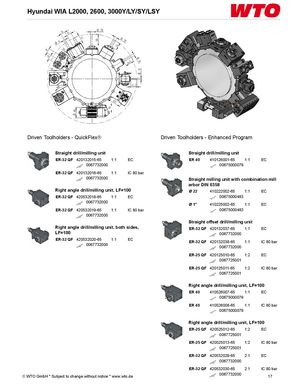 Hyundai WIA L2000, 2600, 3000Y/LY/SY/LSY Driven Toolholders - QuickFlex® Driven Toolholders - Enhanced Program Straight drill/milling unit Straight drill/milling unit ER-32 QF 420132015-65 1:1 EC ER 40 410126001-65 1:1 EC 0067732000 00675000079 ER-32 QF 420132016-65 1:1 IC 80 bar 0067732000 Straight milling unit with combination mill arbor DIN 6358 Right angle drill/milling unit, LF=100 Ø 22 410222002-65 1:1 EC ER-32 QF 420532018-65 1:1 EC 00675000483 0067732000 Ø 1" 410225002-65 1:1 EC ER-32 QF 420532019-65 1:1 IC 80 bar 00675000483 0067732000 Straight offset drill/milling unit Right angle drill/milling unit, both sides, ER-32 QF 420132037-65 1:1 EC LF=100 0067732000 ER-32 QF 420532020-65 1:1 EC ER-32 QF 420132038-65 1:1 IC 80 bar 0067732000 0067732000 ER-25 QF 420125010-65 1:2 EC 0067725001 ER-25 QF 420125011-65 1:2 IC 80 bar 0067725001 Right angle drill/milling unit, LF=100 ER 40 410526007-65 1:1 EC 00675000079 ER 40 410526008-65 1:1 IC 80 bar 00675000079 Right angle drill/milling unit, LF=100 ER-25 QF 420525012-65 1:2 EC 0067725001 ER-25 QF 420525013-65 1:2 IC 80 bar 0067725001 ER-32 QF 420532029-65 2:1 EC 0067732000 ER-32 QF 420532030-65 2:1 IC 80 bar © WTO GmbH * Subject to change without notice * www.wto.de 0067732000 17