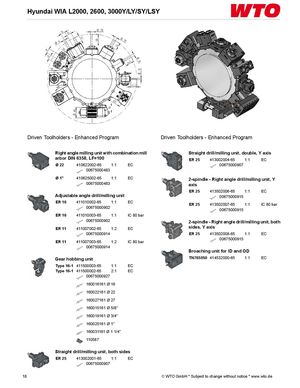 Hyundai WIA L2000, 2600, 3000Y/LY/SY/LSY Driven Toolholders - Enhanced Program Driven Toolholders - Enhanced Program Right angle milling unit with combination mill Straight drill/milling unit, double, Y axis arbor DIN 6358, LF=100 ER 25 413002004-65 1:1 EC Ø 22 410622002-65 1:1 EC 00675000907 00675000483 Ø 1" 410625002-65 1:1 EC 2-spindle - Right angle drill/milling unit, Y 00675000483 axis ER 25 413502006-65 1:1 EC Adjustable angle drill/milling unit 00675000915 ER 16 411010002-65 1:1 EC ER 25 413502007-65 1:1 IC 80 bar 00675000902 00675000915 ER 16 411010003-65 1:1 IC 80 bar 00675000902 2-spindle - Right angle drill/milling unit, both ER 11 411007002-65 1:2 EC sides, Y axis 00675000914 ER 25 413502008-65 1:1 EC ER 11 411007003-65 1:2 IC 80 bar 00675000915 00675000914 Broaching unit for ID and OD Gear hobbing unit TN765050 414532000-65 1:1 EC Type 16-1 411500003-65 1:1 EC Type 16-1 411500002-65 2:1 EC 00675000927 160016161 Ø 16 160022161 Ø 22 160027161 Ø 27 160015161 Ø 5/8" 160019161 Ø 3/4" 160025161 Ø 1" 160031161 Ø 1 1/4" 110587 Straight drill/milling unit, both sides ER 25 413002001-65 1:1 EC 00675000907 18 © WTO GmbH * Subject to change without notice * www.wto.de