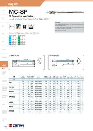 Long Taps Intro MC-SP GP General Purpose Series SP Long Shank Spiral Fluted Taps with Axial Coolant Hole FEATURES SL HSS-E 2.5PTHCHT Long shank general purpose for extended overhang onblind hole application.For steel application at medium-low cutting speed, alsosuitable for non-ferrous materials. With axial coolant hole. PO Recommended Tapping Speeds Depending On Materials ISO Vc (m/min) ISO Vc (m/min) P1 5÷10 I N1 5÷10 I P2 5÷10 H N2 5÷10 I ST P3 5÷10 I N3 5÷10 I P4 5÷8 I N4 5÷10 I H 1st choice I suitable ROLL JIS-MC-SP TYPE: SP_006 TYPE: SP_009 CARBIDE K K DCON DCON LONG THLLU LS LK KLF THL LK KTHLTHL JIS HAND TAPS M TCTR Ø Hole Ø(tolerance)(mm)(mm)CodeTHCHT(chamfer)LF(mm)THL(mm) LU(mm) LS DCON K(mm)(mm)(mm)LK(mm)NOFType Stock JIS EG (STI) P2 5 5.09 MSHQ6.0ML10 2.5P 100 19 28 40 6 4.5 7 3 006 f M6X1 P2 5 5.09 MSHQ6.0ML15 2.5P 150 19 28 40 6 4.5 7 3 006 f SPECIAL M8X1.25 P2 6.8 6.85 MSHQ8.0NL10 2.5P 100 22 - 50 6.2 5 8 3 009 f THREADS, P2 6.8 6.85 MSHQ8.0NL15 2.5P 150 22 - 50 6.2 5 8 3 009 f GAUGES P2 8.5 8.6 MSHQ010OL10 2.5P 100 24 - 50 7 5.5 8 3 009 f M10X1.5 P2 8.5 8.6 MSHQ010OL15 2.5P 150 24 - 50 7 5.5 8 3 009 f THREAD P2 10.3 10.36 MSHQ012PL10 2.5P 100 29 - 50 8.5 6.5 9 3 009 f MILLS M12X1.75 P2 10.3 10.36 MSHQ012PL15 2.5P 150 29 - 50 8.5 6.5 9 3 009 f P2 10.3 10.36 MSHQ012PL20 2.5P 200 29 - 50 8.5 6.5 9 3 009 f P2 12 12.12 MSHQ014QL15 2.5P 150 30 - 60 10.5 8 11 3 009 f M14X2 DIES P2 12 12.12 MSHQ014QL20 2.5P 200 30 - 60 10.5 8 11 3 009 f P2 14 14.12 MSHQ016QL15 2.5P 150 32 - 60 12.5 10 13 3 009 f M16X2 P2 14 14.12 MSHQ016QL20 2.5P 200 32 - 60 12.5 10 13 3 009 f P3 15.5 15.63 MSHR018RL15 2.5P 150 37 - 70 14 11 14 4 009 f CENTER M18X2.5DRILLS P3 15.5 15.63 MSHR018RL20 2.5P 200 37 - 70 14 11 14 4 009 f Technical info 450