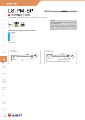 Long Taps Intro LS-PM-SP MS Material Specific Series SP Long Shank Spiral Fluted Taps for Hard Materials (<45HRC) FEATURES SL HSS-P 2.75PTHCHT Long shank material specific for extended overhang onblind hole application.Specific design and high class HSSP for stable and longlife on alloy steel and tool steel (30 ÷ 45HRC) application. Reliable and high performance tapping for the mould&die industry. PO Recommended Tapping Speeds Depending On Materials ISO Vc (m/min) P3 2÷10 I P4 2÷7 H ST P5 2÷7 H P6 2÷5 H H 1st choice I suitable ROLL JIS-LS-PM-SP TYPE: SP_005 TYPE: SP_008 CARBIDE KDCON DCON K THLLONGLU LKLS KLF THL LK KLSLF JIS HAND TAPS EG (STI) SPECIAL THREADS, GAUGES THREAD MILLS DIES CENTER DRILLS Technical info 452