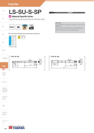 Long Taps Intro LS-SU-S-SP MS Material Specific Series SP Long Shank Spiral Fluted Taps for Stainless Steel FEATURES SL HSS-E OX 2.5PTHCHT Long shank for extended overhang on blind holeapplication.Material specific for stainless steel and steel application. With OX treatment to reduce welding troubles. PO Recommended Tapping Speeds Depending On Materials ISO Vc (m/min) ISO Vc (m/min) P2 ≤10 H M1 ≤10 H P3 ≤10 H ST P4 ≤10 I P7 ≤10 H H 1st choice I suitable ROLL JIS-LS-SU-S-SP TYPE: SP_005 TYPE: SP_008 CARBIDE KDCON DCON K THLLONGLU LKLS KLF THL LK KLSLF JIS HAND TAPS EG (STI) SPECIAL THREADS, GAUGES THREAD MILLS DIES CENTER DRILLS Technical info 454