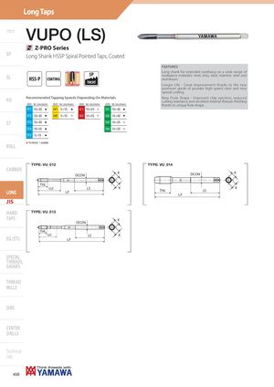 Long Taps Intro VUPO (LS) Z-PRO Series SP Long Shank HSSP Spiral Pointed Taps, Coated FEATURES SL HSS-P COATING 5P Long shank for extended overhang on a wide range ofworkpiece materials: steel, alloy steel, stainless steel andaluminium. THCHT Longer Life - Great improvement thanks to the new premium grade of powder high speed steel and new special coating. PO Recommended Tapping Speeds Depending On Materials New Flute Shape - Improved chip ejection, reducedcutting resistance and excellent internal threads finishing ISO Vc (m/min) ISO Vc (m/min) ISO Vc (m/min) ISO Vc (m/min) thanks to unique flute shape. P1 10÷30 H M1 5÷15 H K1 10÷20 I N1 10÷40 H P2 10÷30 H M2 5÷10 I K2 10÷20 I N2 10÷40 H ST P3 10÷30 H N3 10÷25 I P4 10÷25 H N4 10÷20 I P7 5÷15 H H 1st choice I suitable ROLL JIS-VUPO (LS) TYPE: VU_012 TYPE: VU_014 CARBIDE KDCON DCON K THL LU LS KLONGLF KTHLLSLF JIS HAND TYPE: VU_013 TAPS K DCON THL EG (STI) LU LSLF K SPECIAL THREADS, GAUGES THREAD MILLS DIES CENTER DRILLS Technical info 456